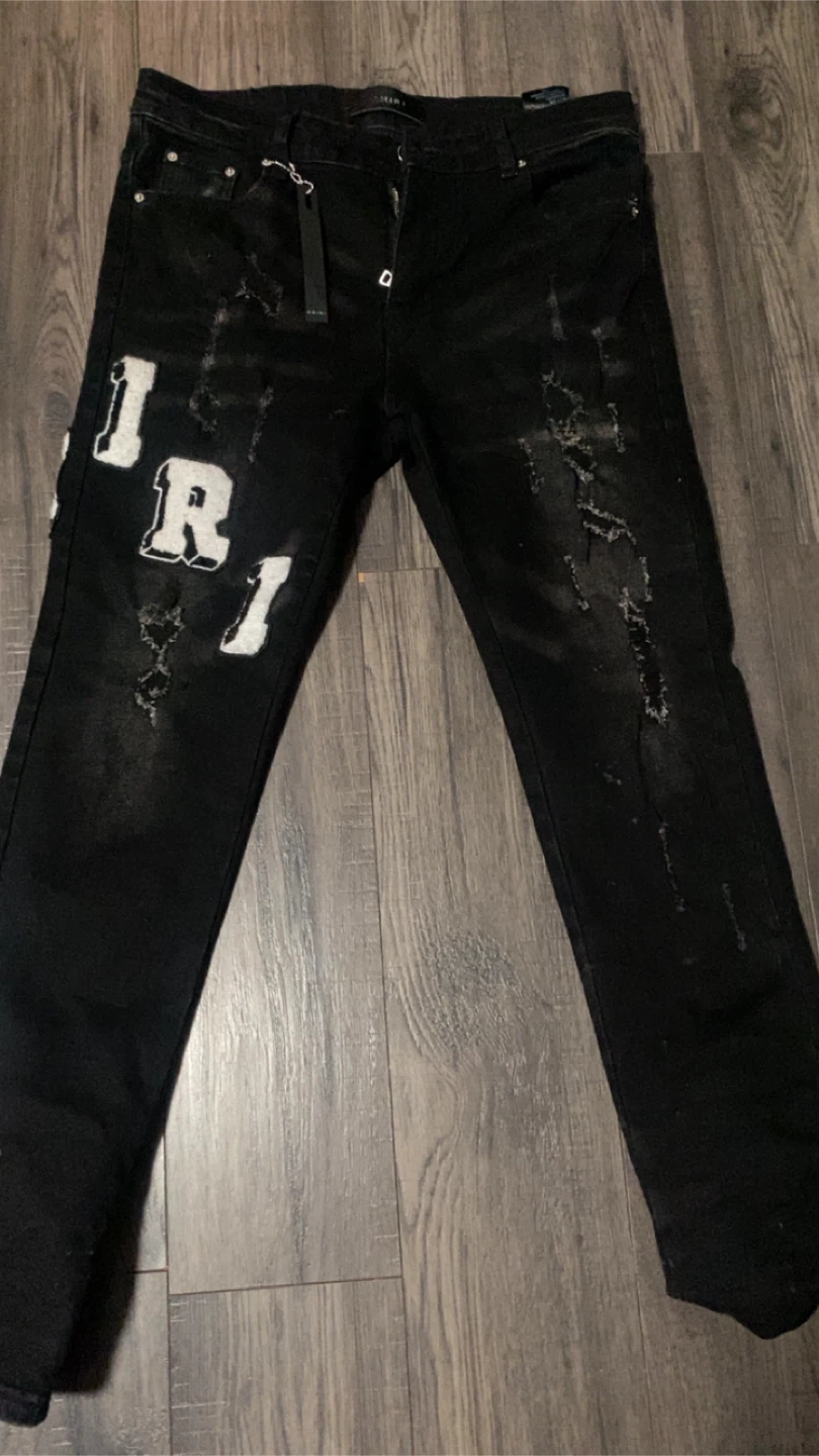 AMIRI black distressed denim jeans. Features white letter applique spelling out 'AMIRI' on the legs. Made from durable denim material. These pants offer a unique, edgy style.