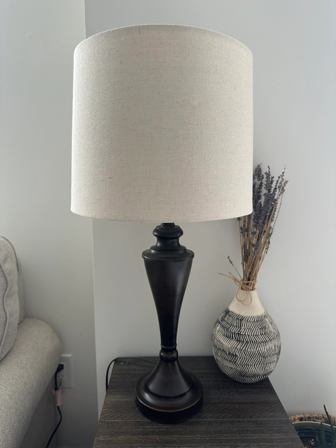 Two beautiful table lamps.Dark bronze coloured base linen shade. Perfect for a bedside table or living room.