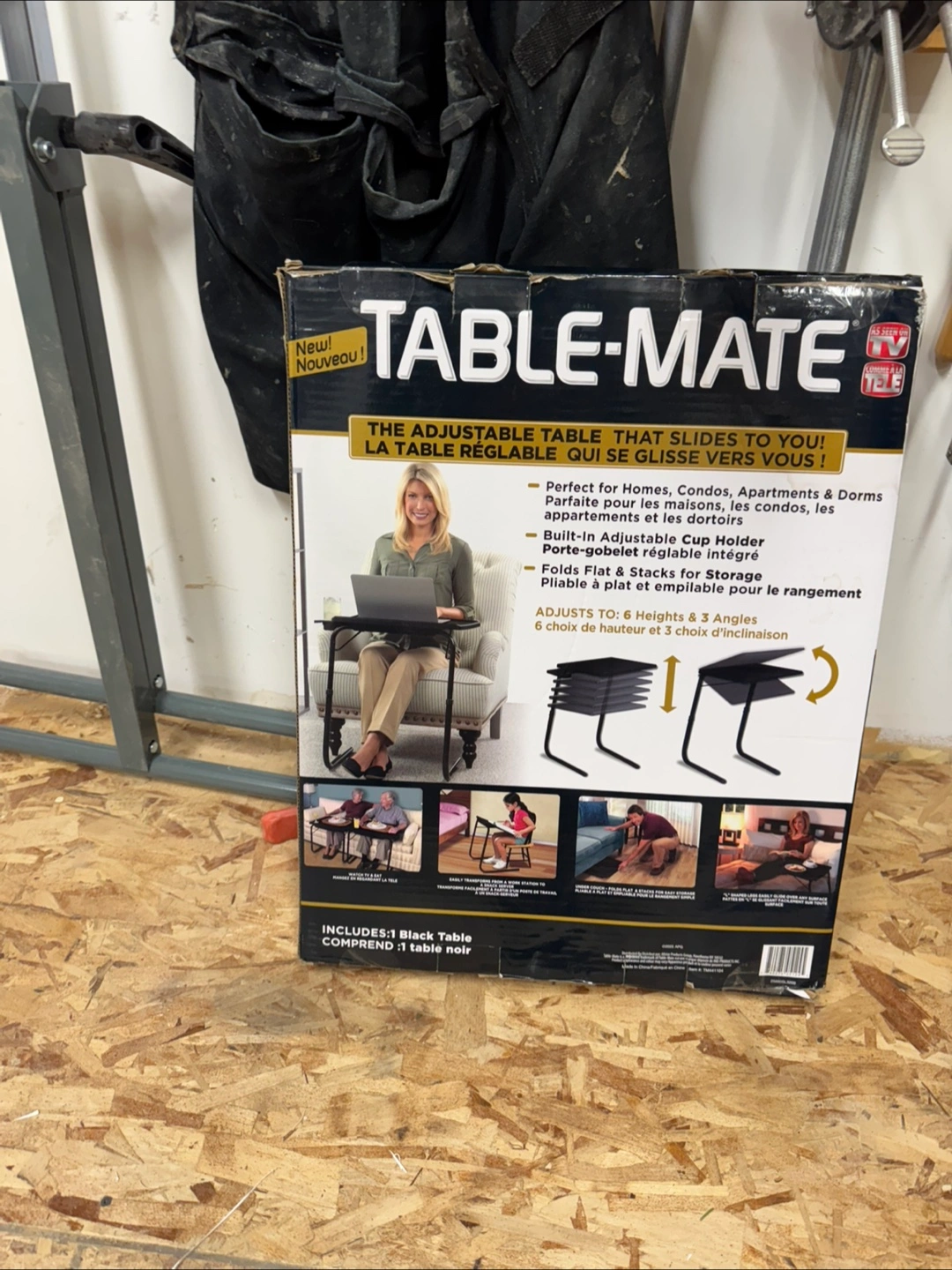 Adjustable table, folds flat, stacks for storage. Includes cup holder. Six height and three angle adjustments.
