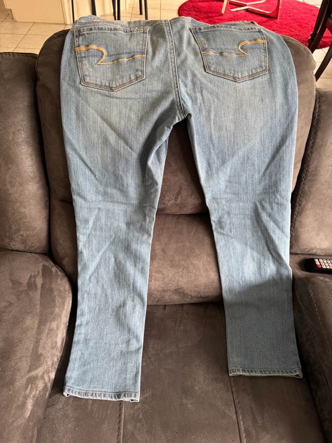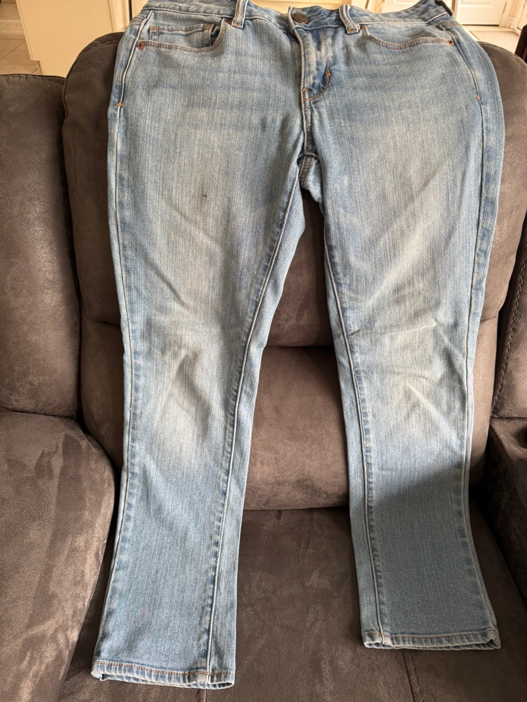 Light wash blue jeans. Skinny fit. Size 4. Made in Cambodia. 98% cotton, 2% elastane.