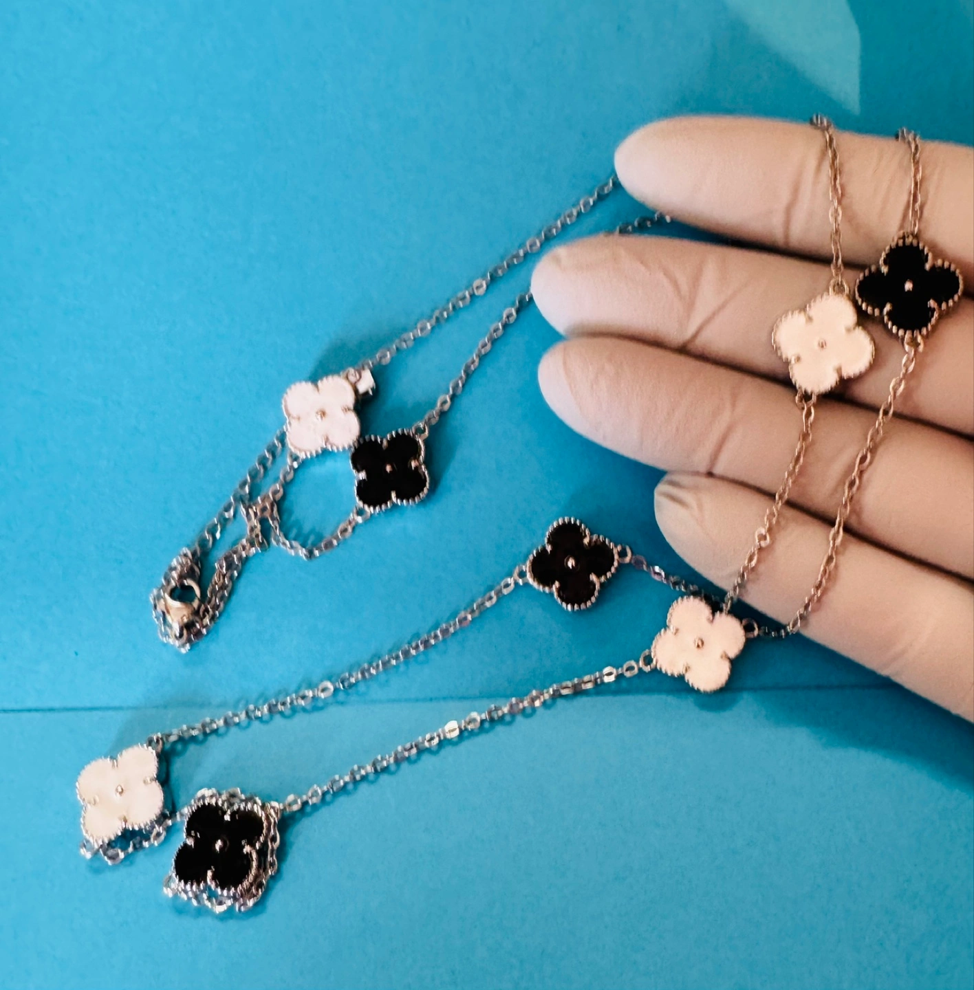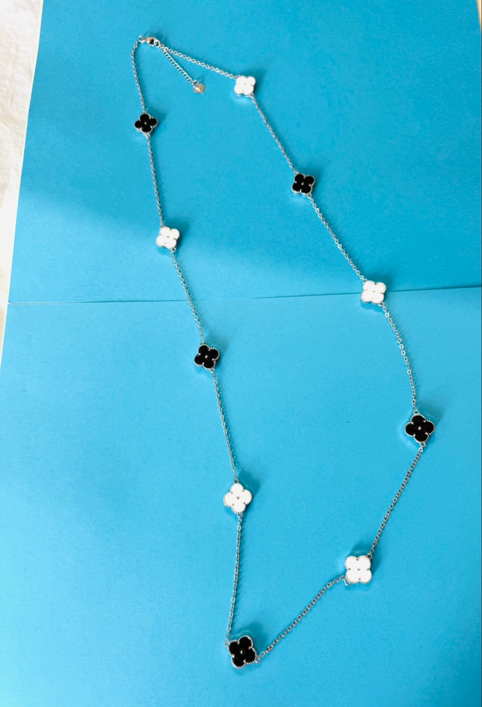 Beautiful long necklace. Black and white enameled clover charms. Silver plated chain. Elegant statement piece. Perfect for layering.