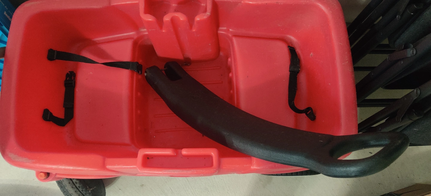Red plastic wagon. Good condition. Includes handle. Suitable for children.