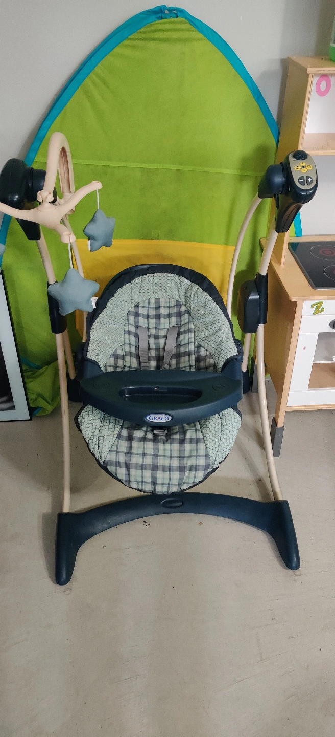 Infant swing. Features multiple swing speeds and soothing vibrations and music. Includes mobile with hanging toys. Good condition.
