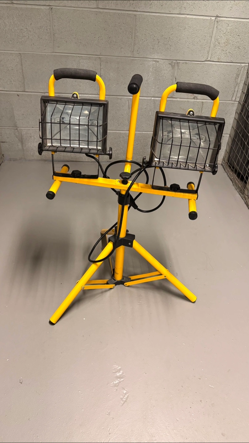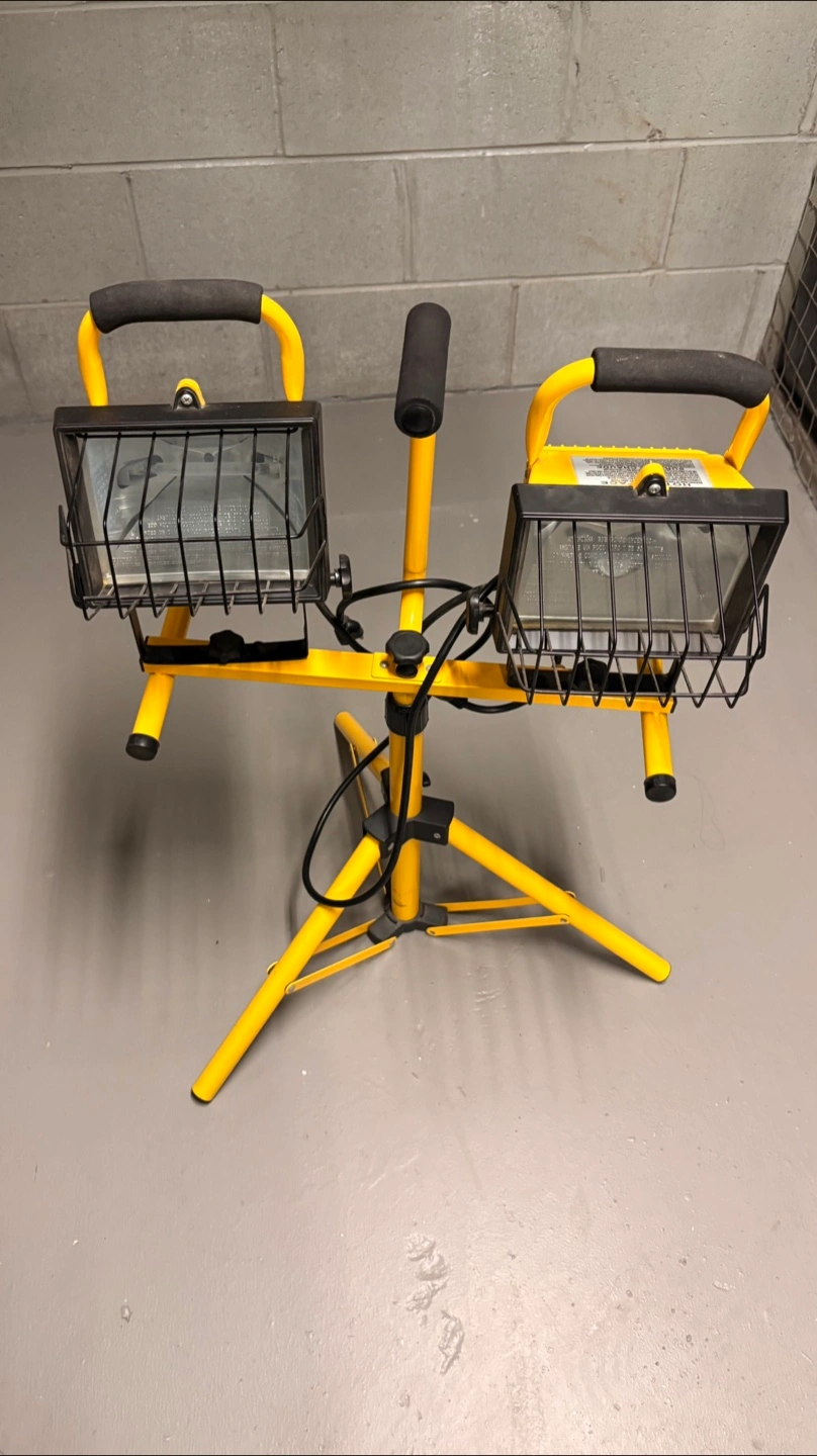 Portable dual head work light. Yellow metal construction. Tripod stand. Great for various applications.