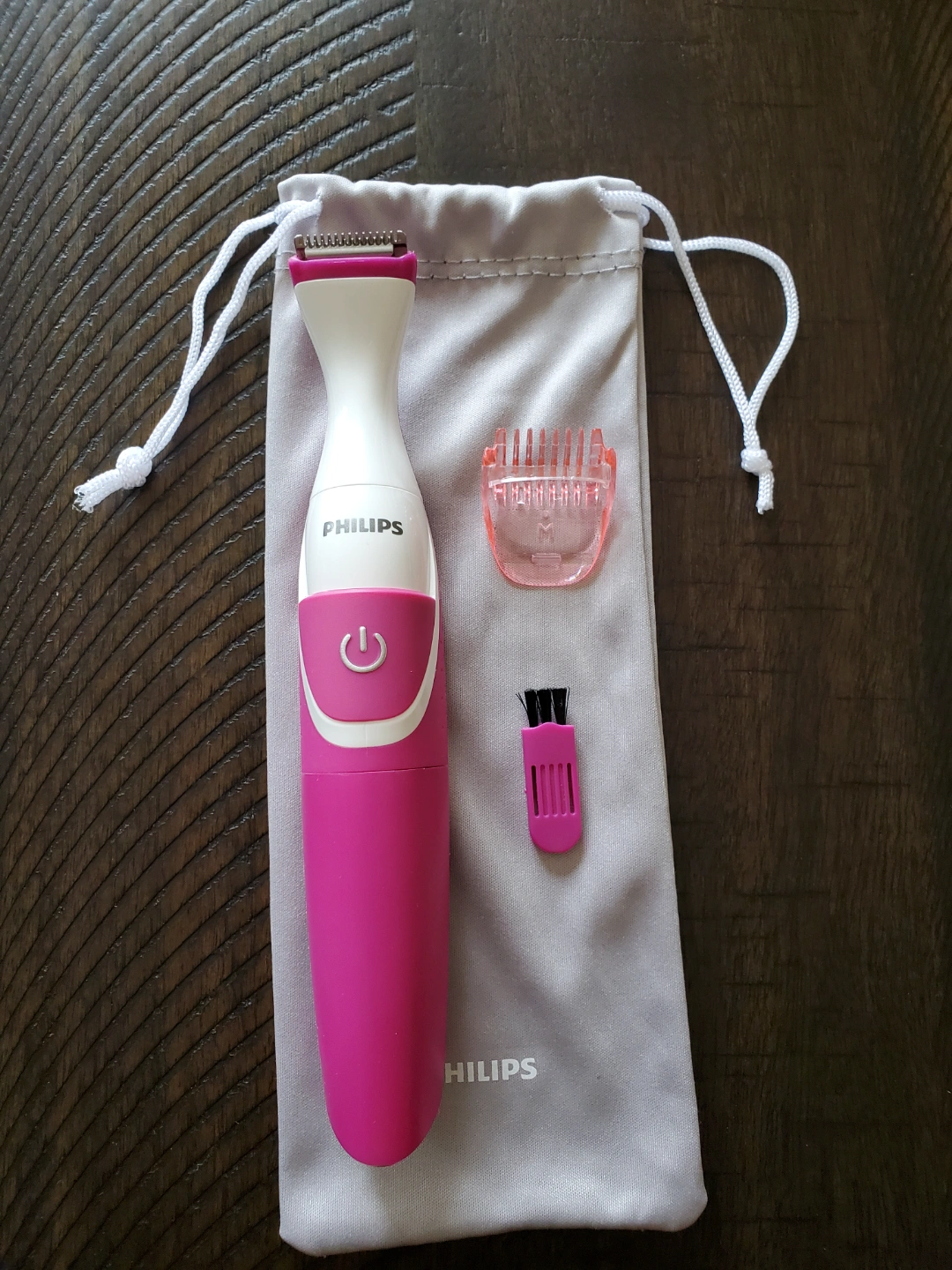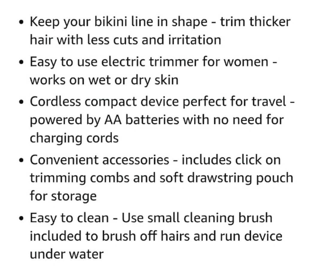 Pink electric trimmer. Comes with comb attachment and cleaning brush. Compact design, easy to store in provided pouch. Requires one AA battery which is included. Hardly used. Excellent condition and works great.