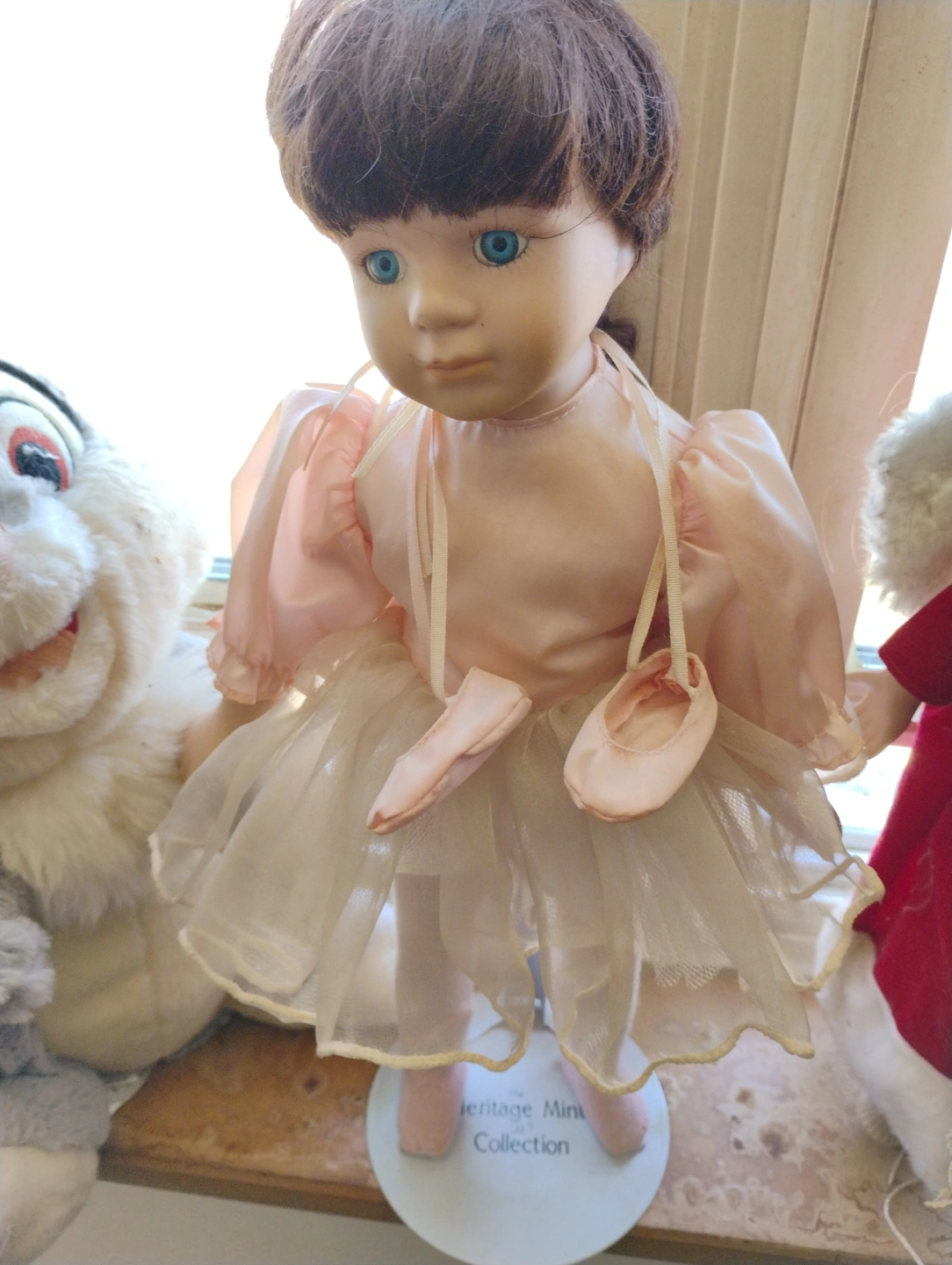 438Porcelain ballerina doll. Pink dress and tulle skirt. Comes with ballet slippers. Part of the Heritage Mint Collection.Needs some TLC (dress needs a wash and foot is broken but can easily be glued). Collectors piece. selling $125;on Etsy. My price $25
