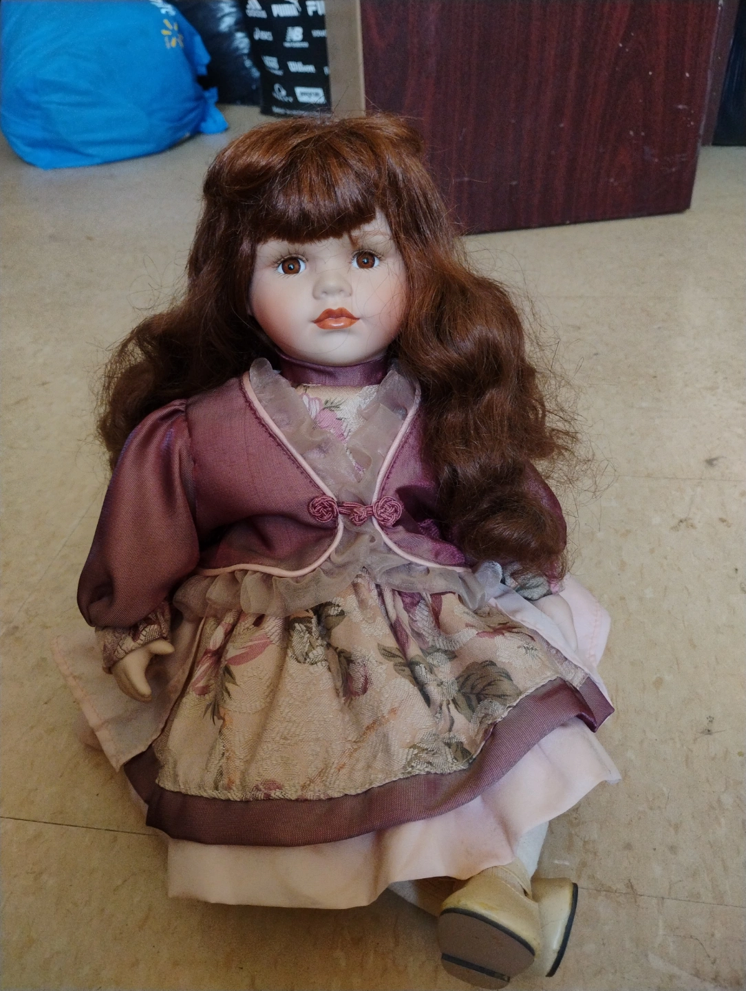 542Beautiful porcelain doll. Long brown hair. Detailed floral dress. Posable. Collector's item. Dress needs a clean.