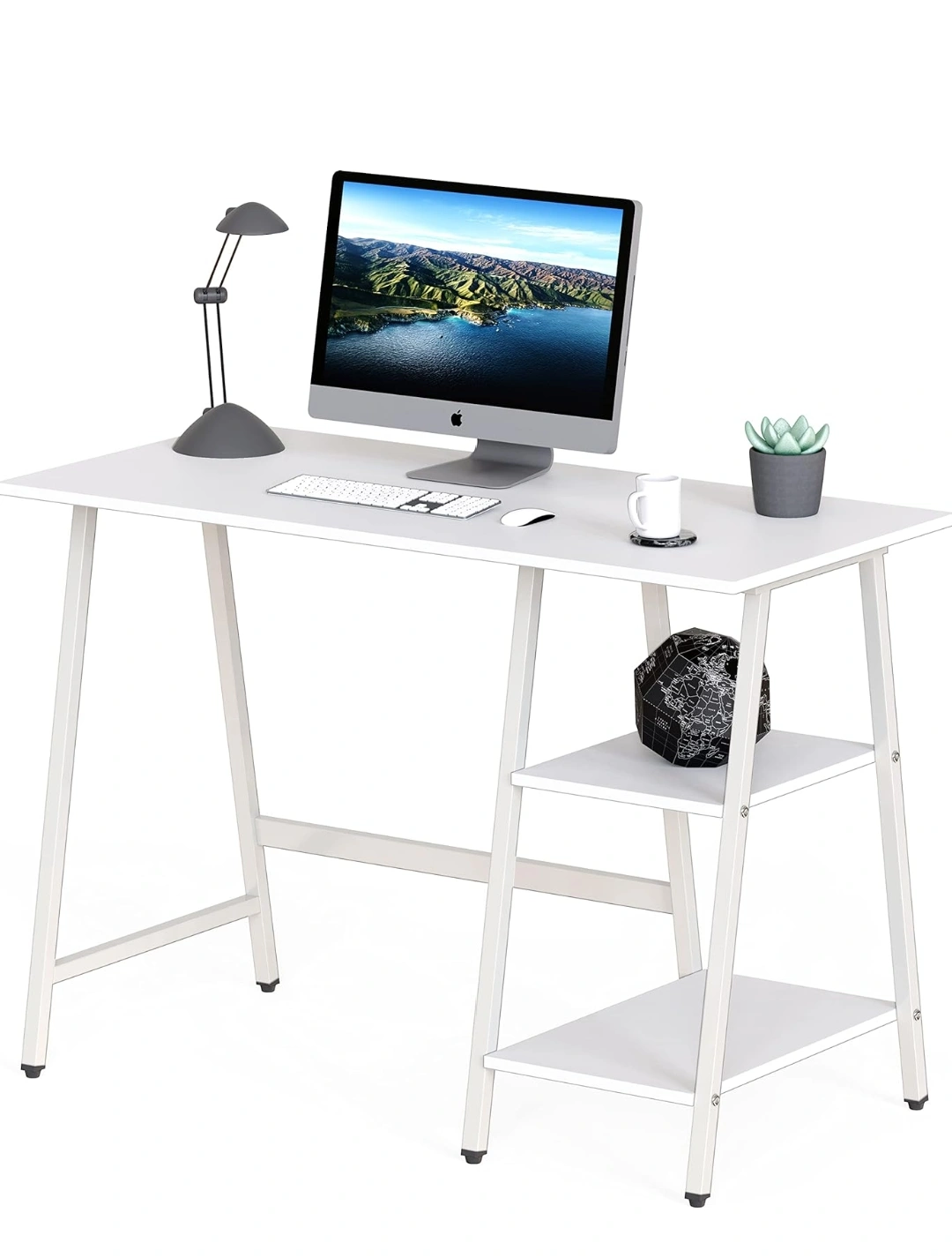Modern minimalist design. Spacious desktop. Two convenient lower shelves. Sturdy metal frame. Ideal for home office or study.