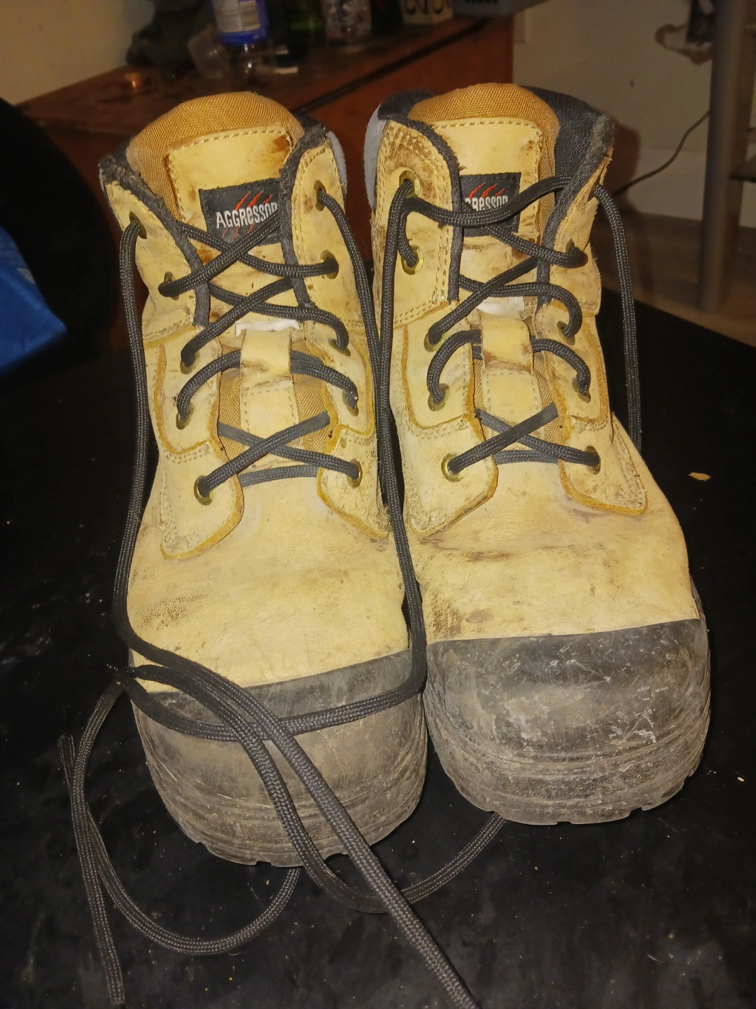 Pair of well-worn tan work boots. Lace-up style. Show significant wear. Good for work or outdoor use.