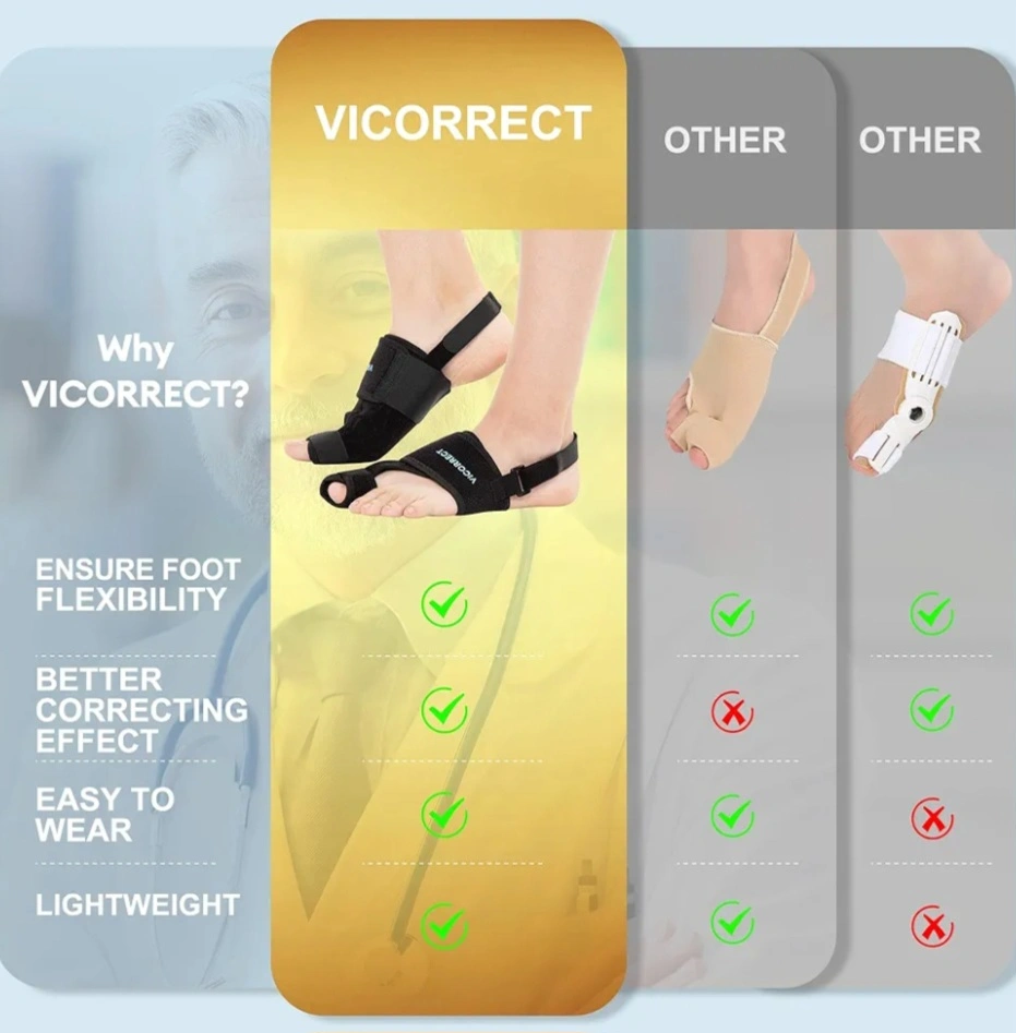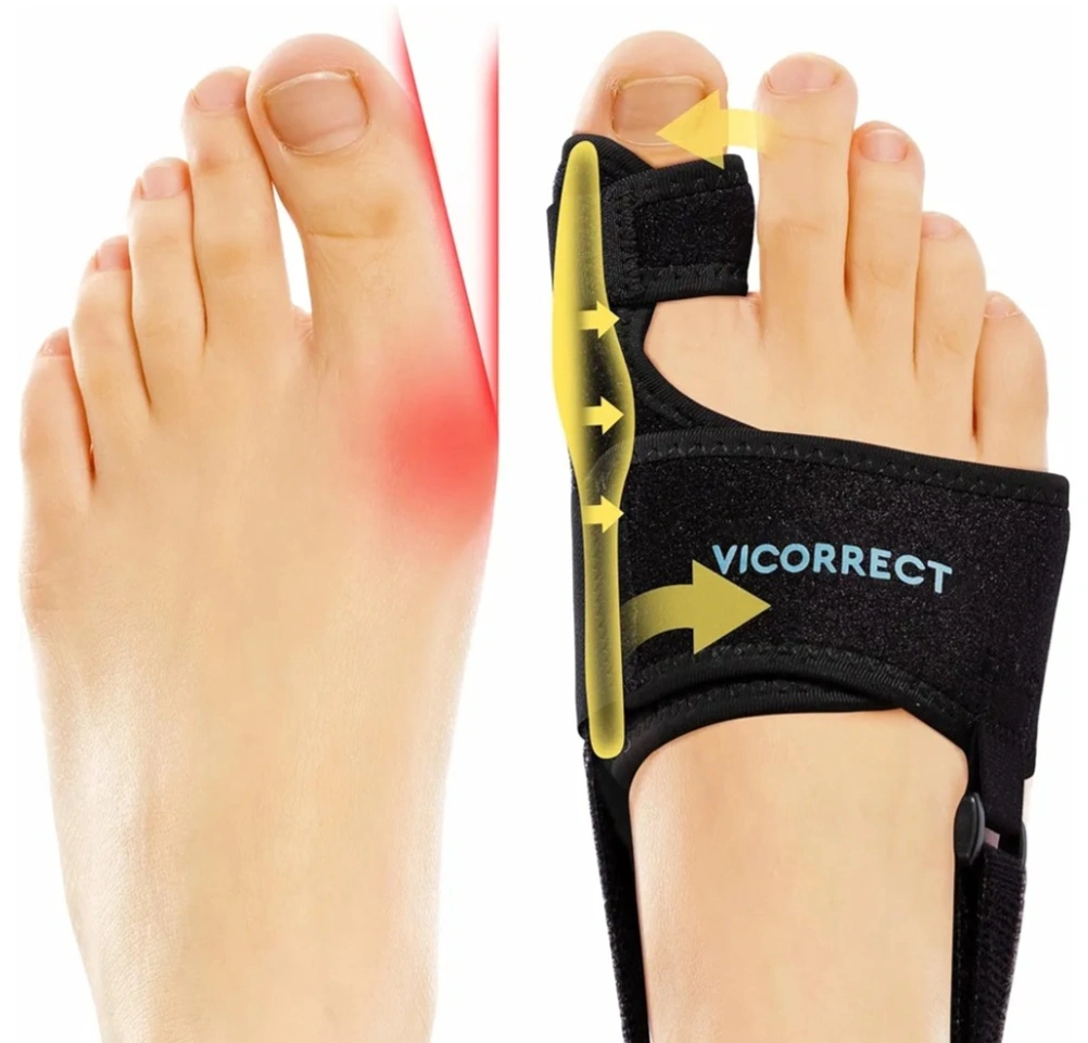 Pair of black bunion correctors. Soft silicone padding. Adjustable straps. Lightweight and breathable. Designed for comfortable wear, day or night.