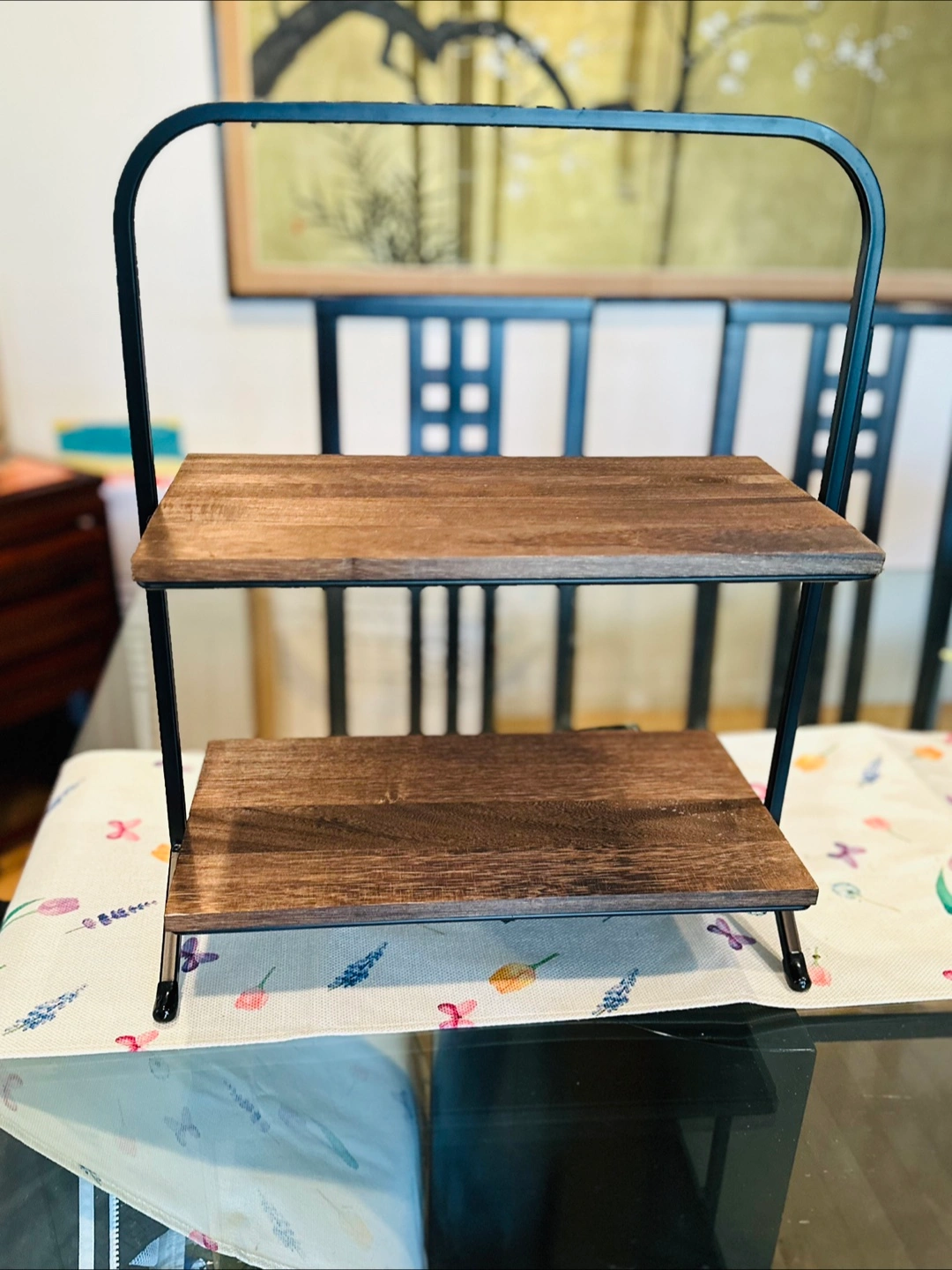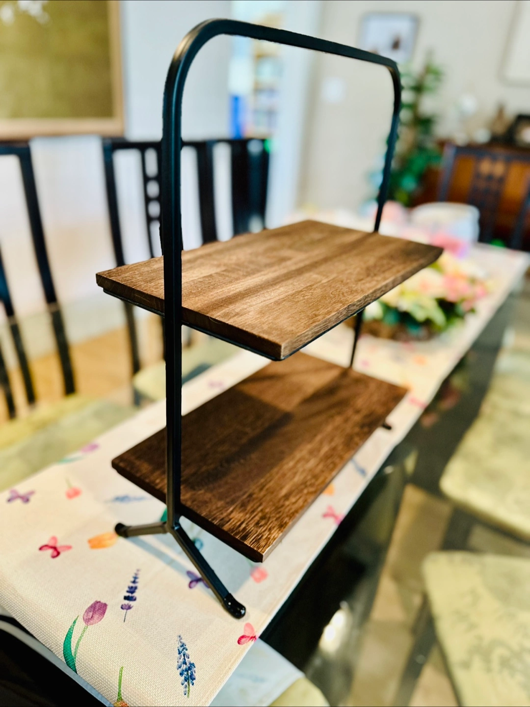 Two-tiered serving stand. Dark brown wood shelves. Black metal frame. Perfect for parties or everyday use. Compact and stylish.