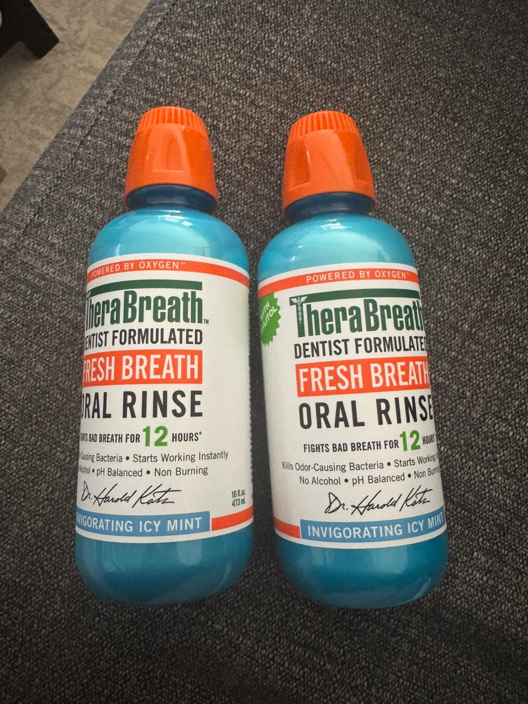 Two bottles of TheraBreath oral rinse. Dentist formulated. Invigorating icy mint flavor. Fights bad breath for 12 hours. Powered by oxygen. No alcohol.