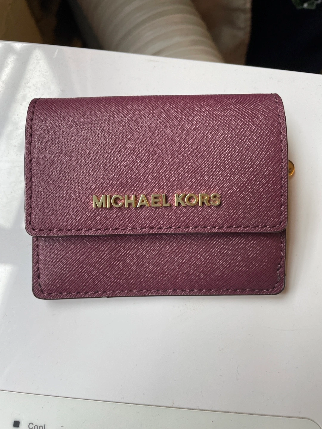 Compact card holder wallet. Burgundy leather. Gold zipper and hardware. Multiple card slots and ID window. Snaps closed.