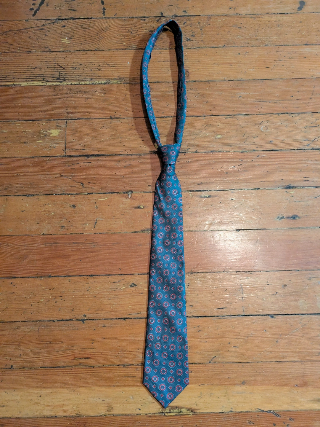 Men's necktie from Moore's. . Grey base colour. Features a repeating red and green geometric pattern. Made in Italy. Hand finished.