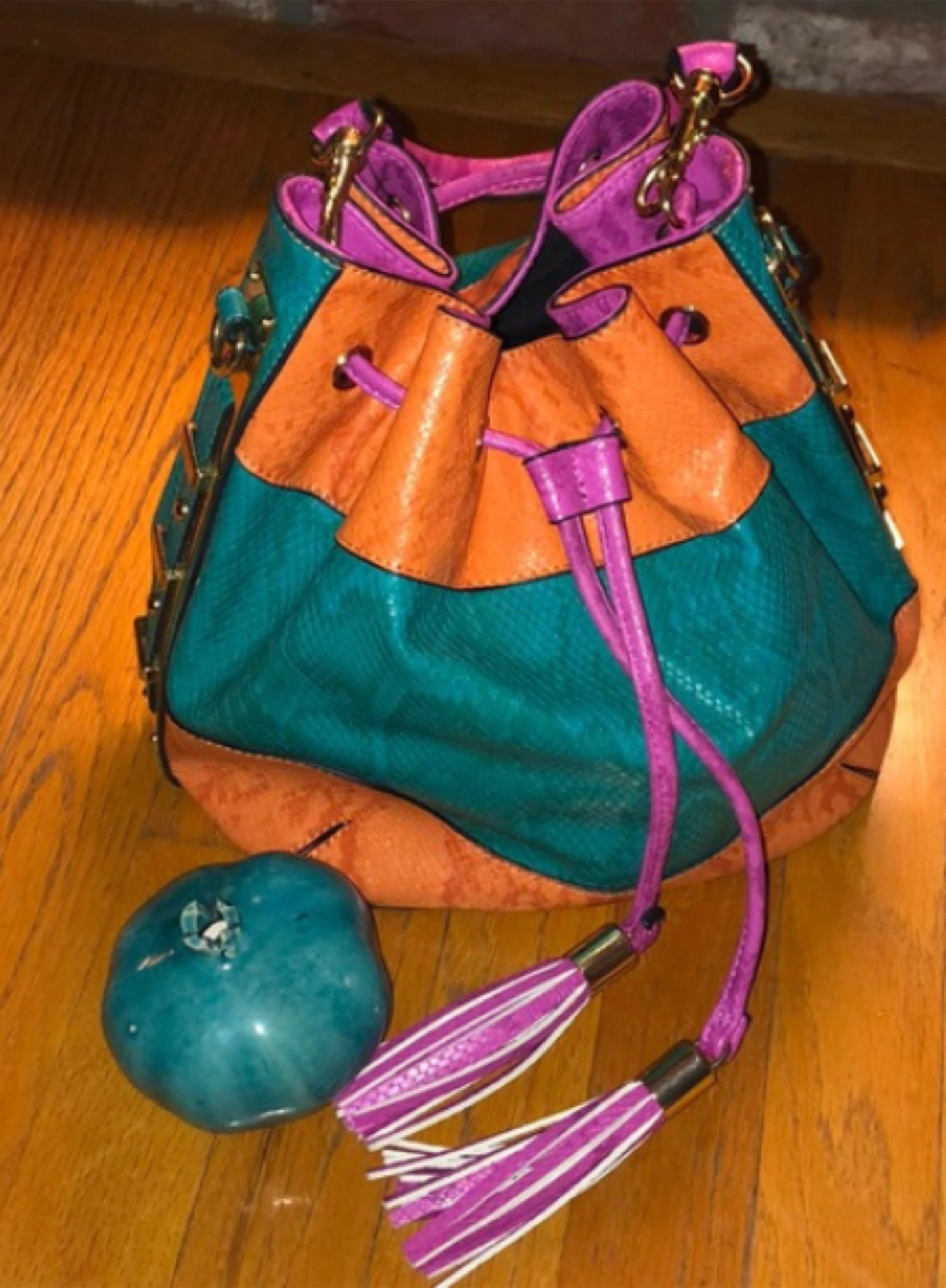 Stylish bucket bag. Features a vibrant teal and orange snakeskin-embossed design. Pink accents on the handles and drawstrings. Gold-toned hardware. Detachable shoulder strap. Drawstring closure. Interior zip pocket.