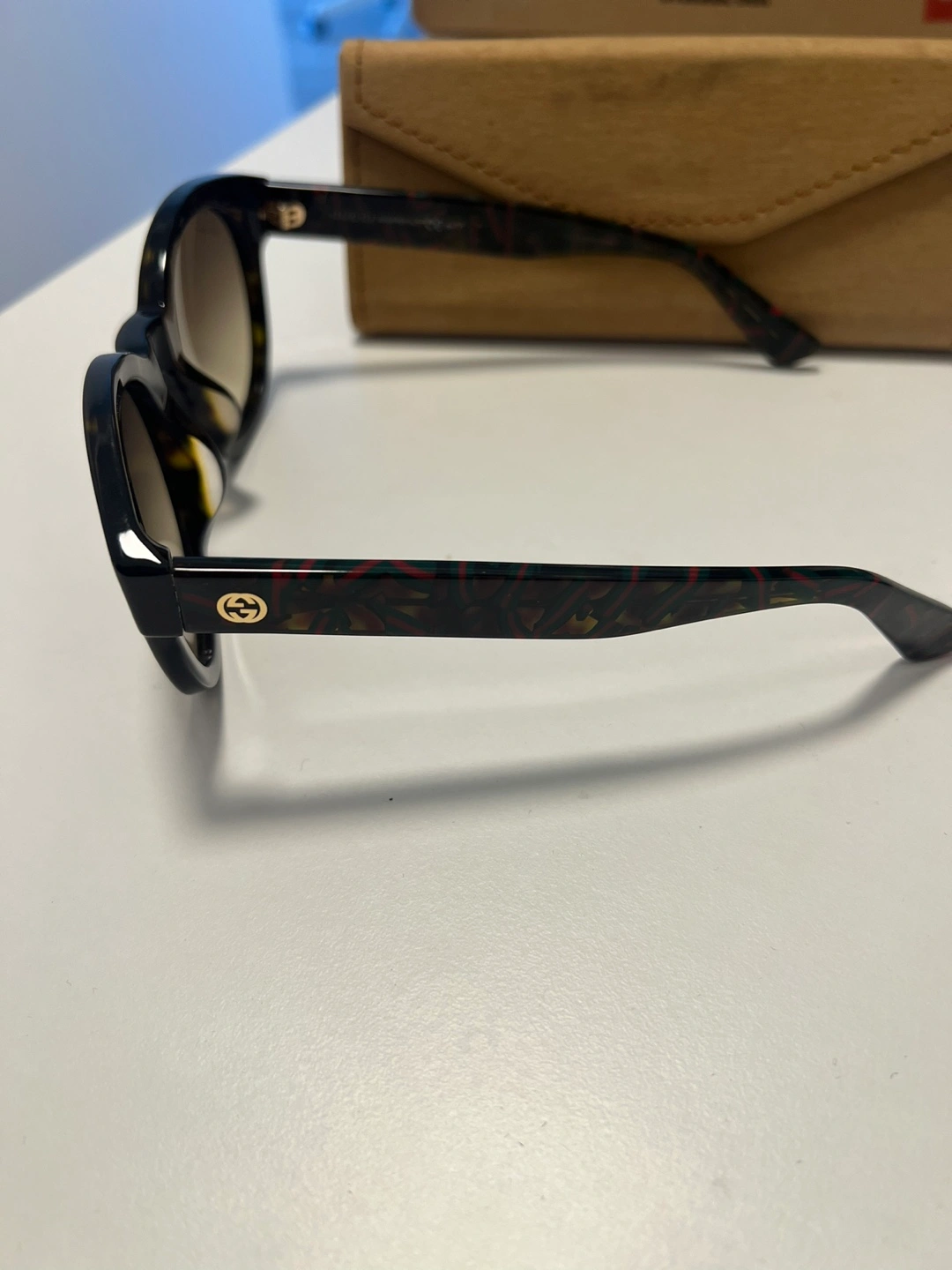 Round tortoiseshell sunglasses. Brown gradient lenses. Gucci logo on the arm. Good condition (minor scratch on lens - you cant really see it well)