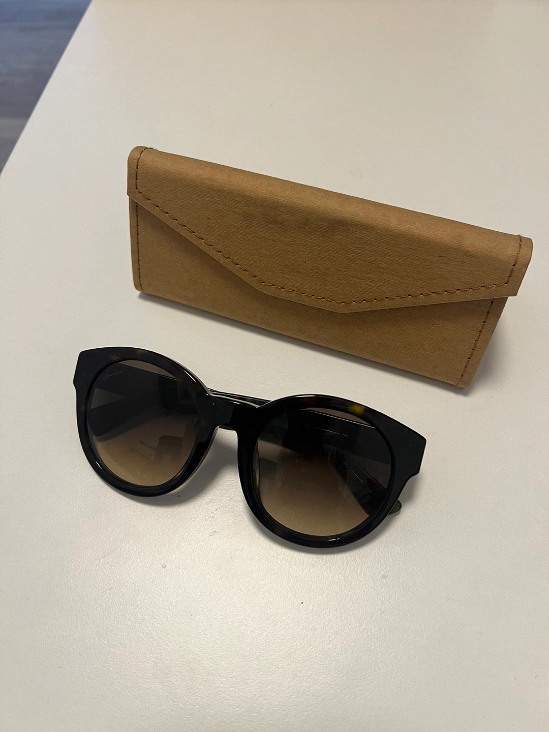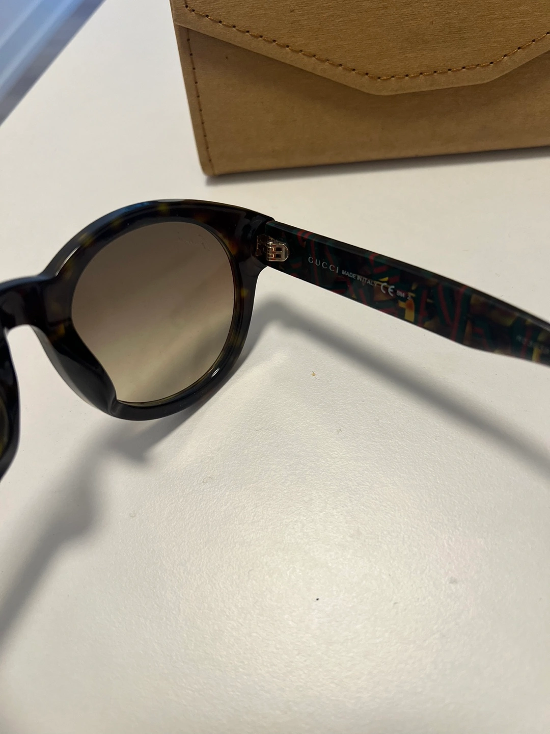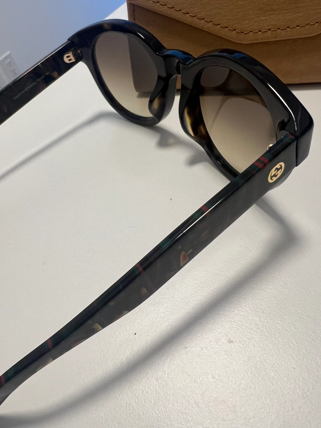 Round tortoiseshell sunglasses. Brown gradient lenses. Gucci logo on the arm. Good condition (minor scratch on lens - you cant really see it well)