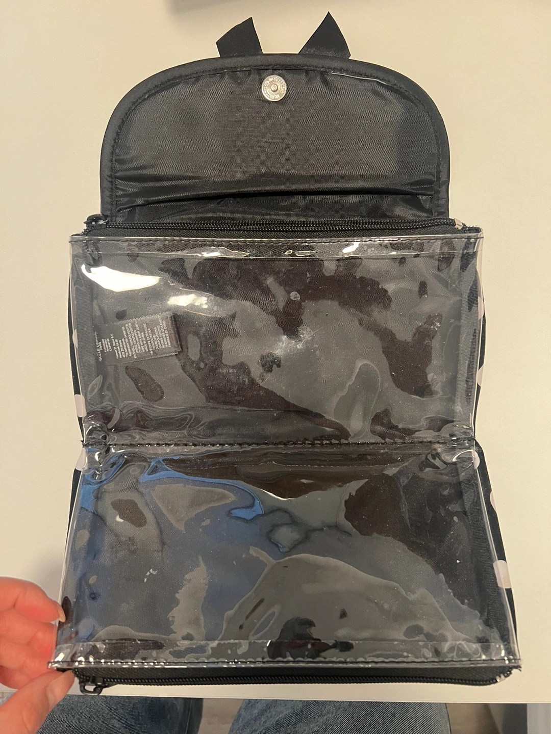 Adorable black satin cosmetic bag. Features white polka dots and a satin bow. Multiple compartments for organization. Perfect for travel.