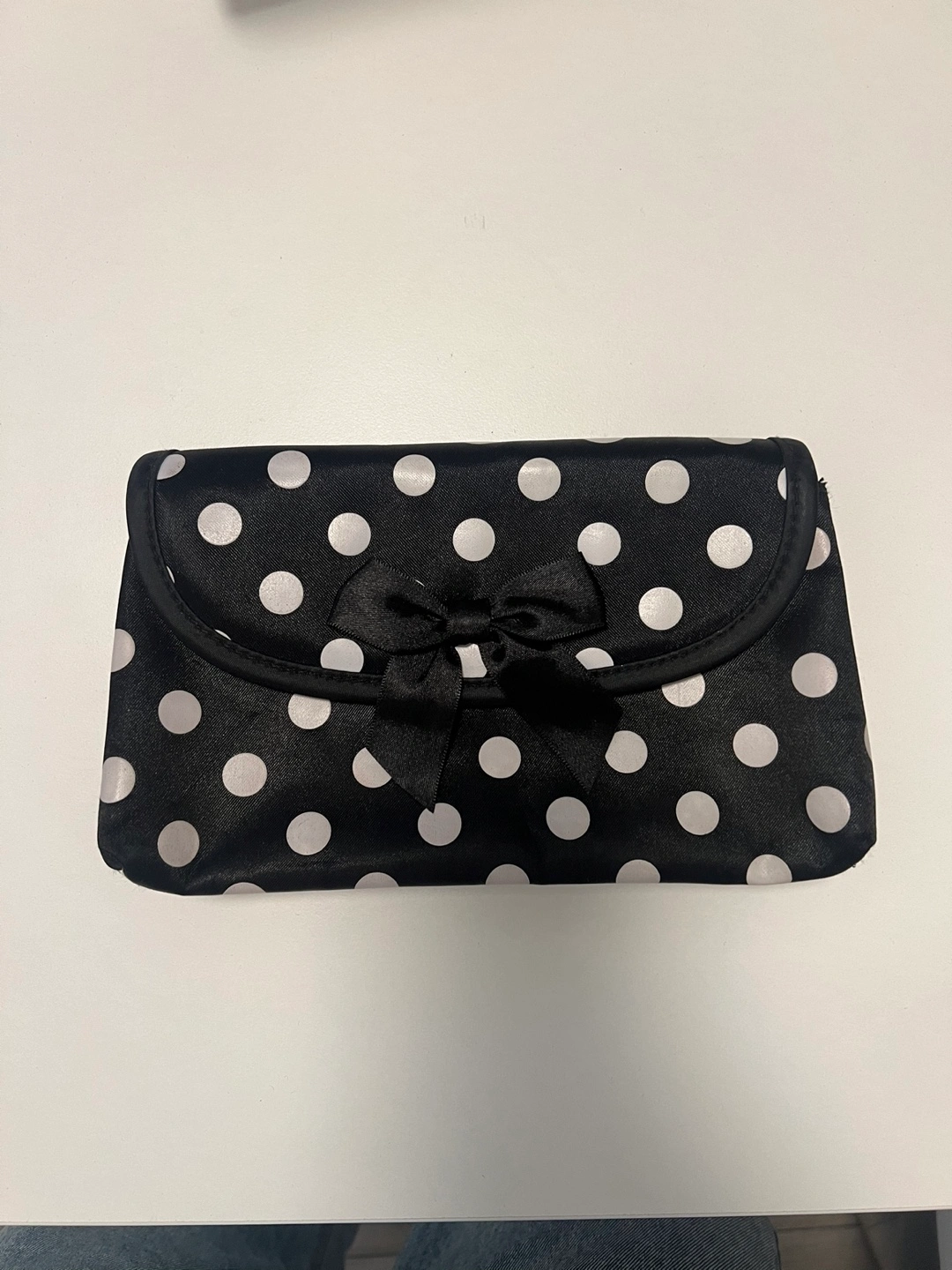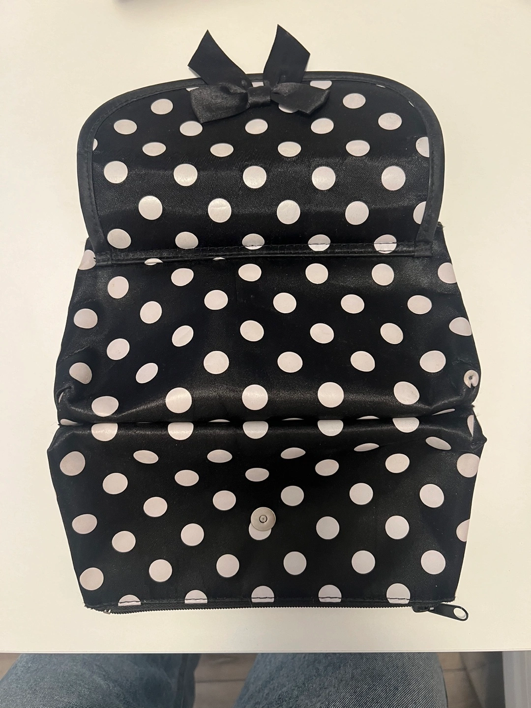 Adorable black satin cosmetic bag. Features white polka dots and a satin bow. Multiple compartments for organization. Perfect for travel.