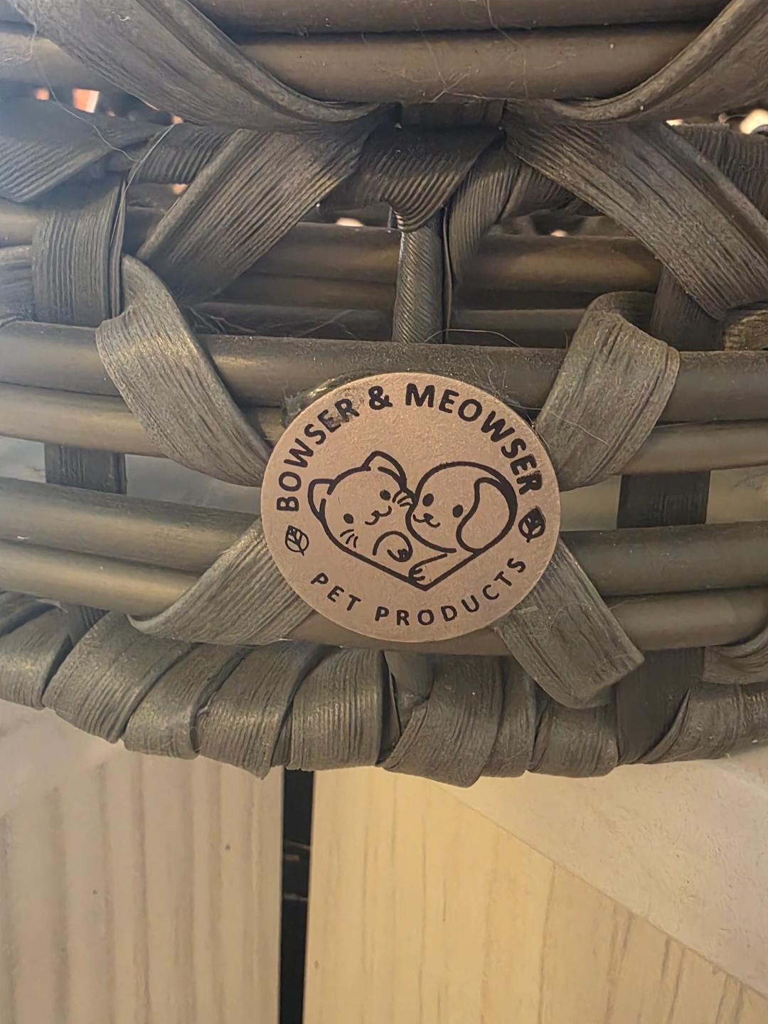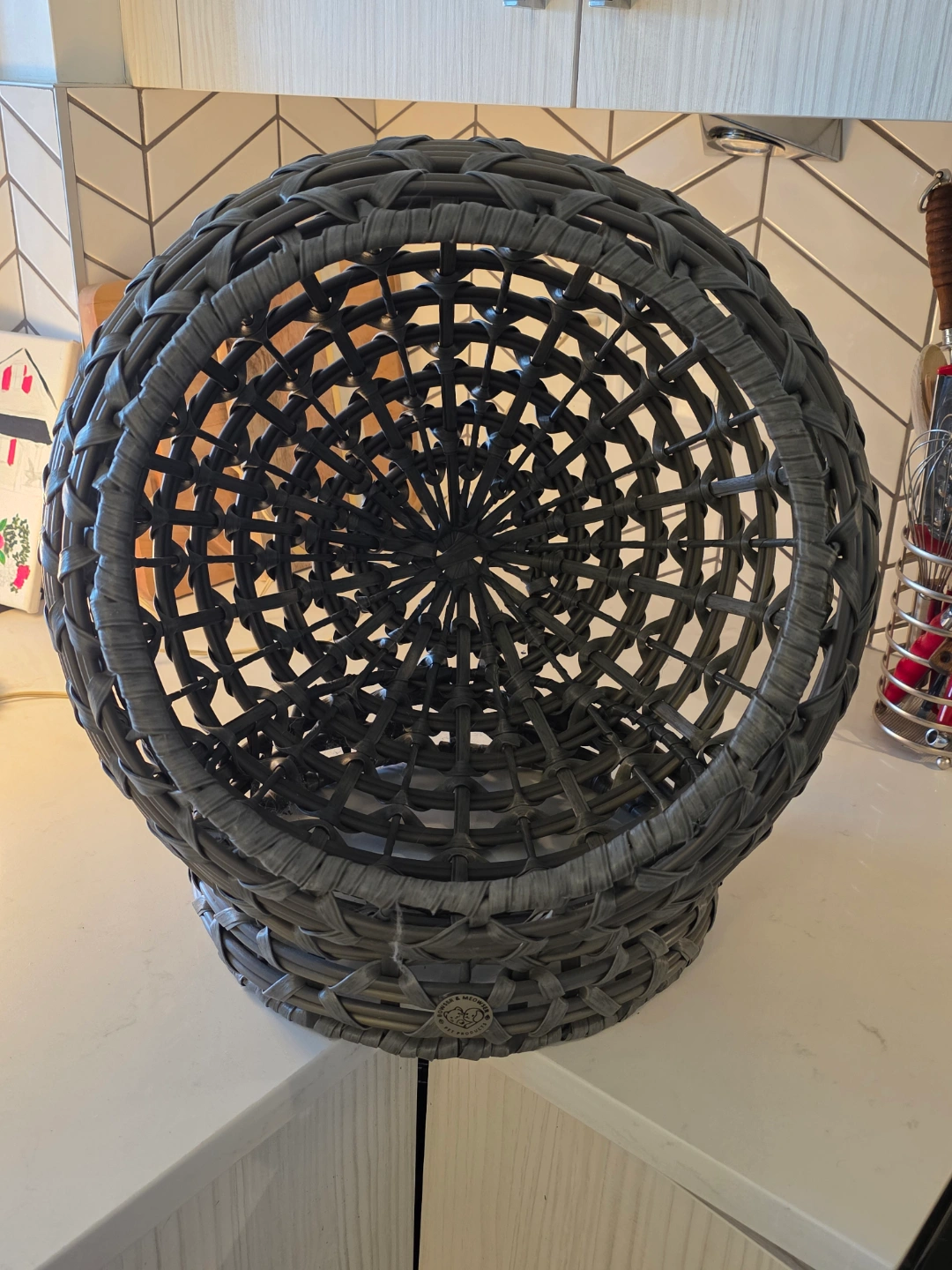 81Unique woven pet bed. Dark grey colour. Looks like wicker or rattan. Good for small to medium-sized pets.