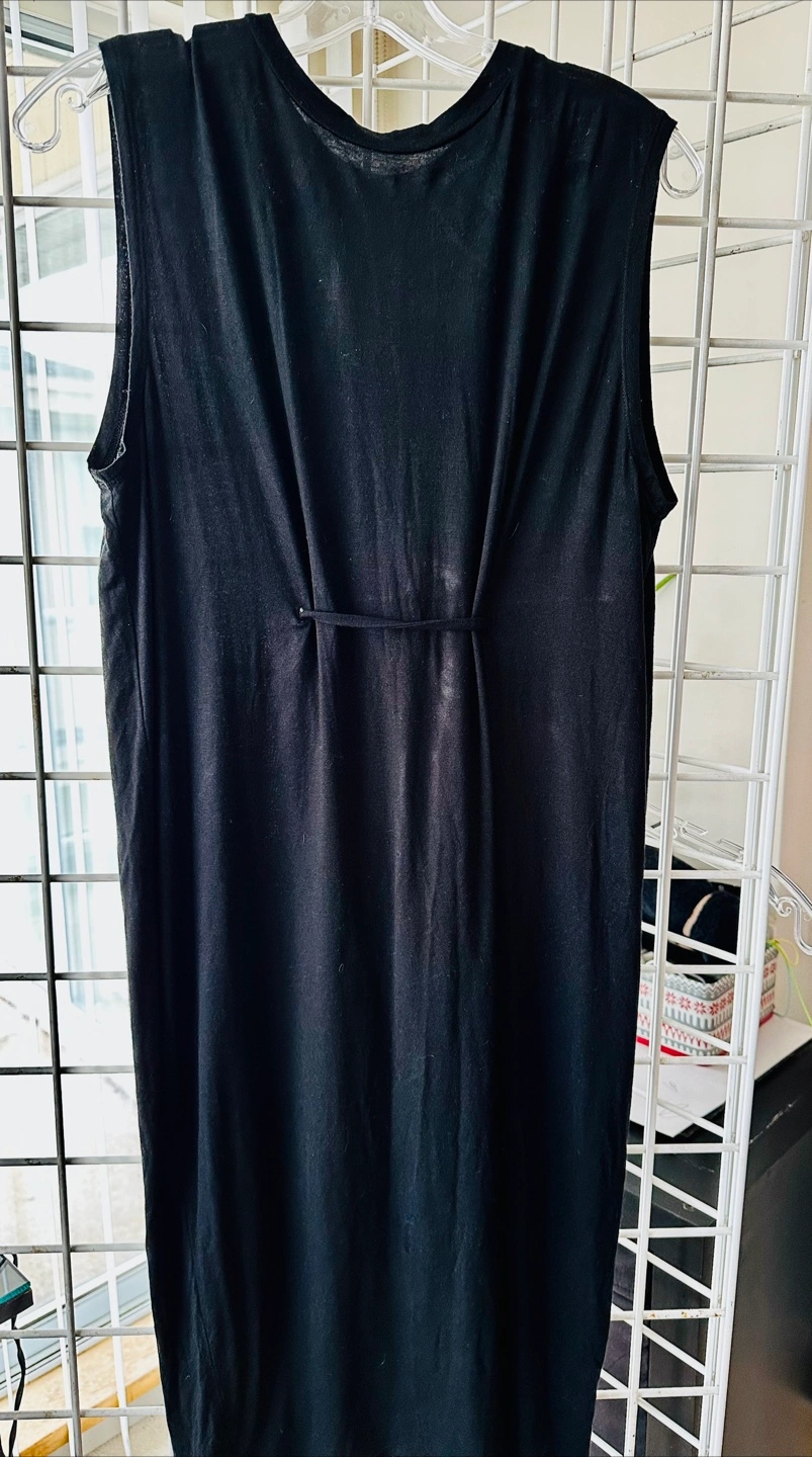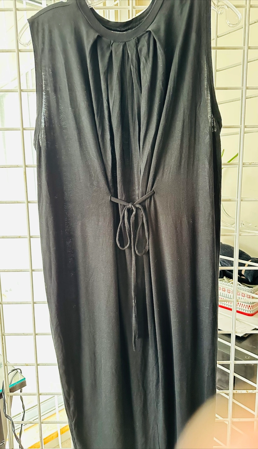 Black sleeveless midi dress. Simple, relaxed fit. Round neckline. Back tie detail. Size small. Made in China.