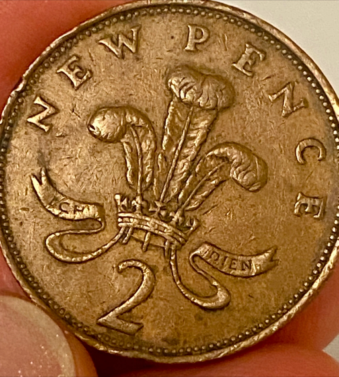 Two pence coin from the United Kingdom. Dated 1971. Features the profile of Queen Elizabeth II and the Welsh three feathers emblem. Shows some wear.