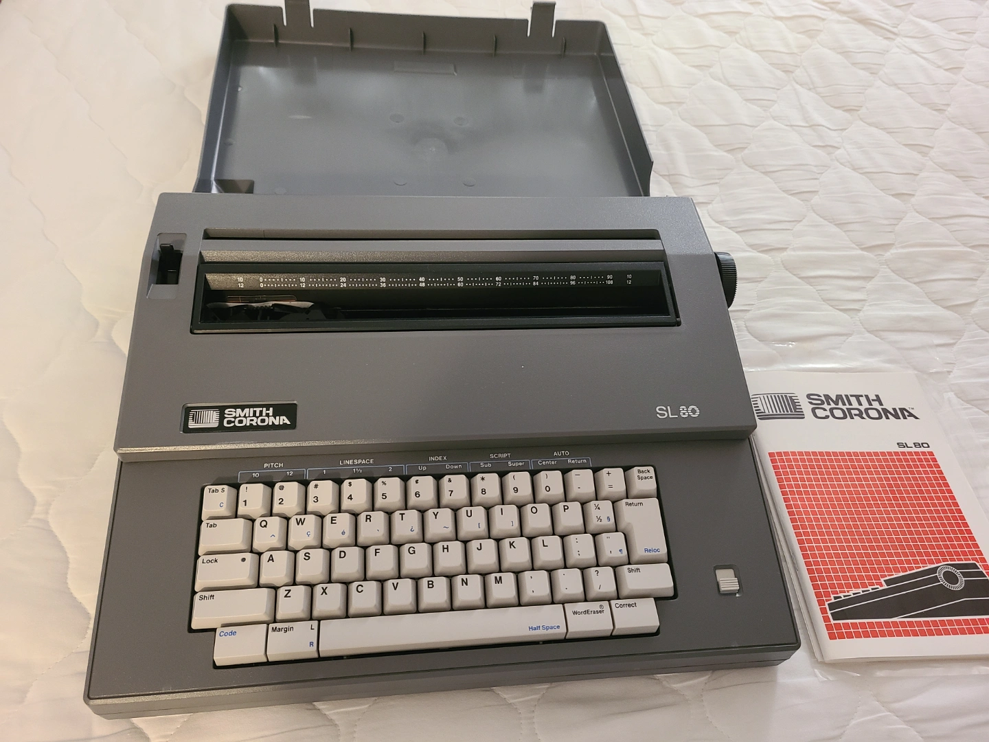 Vintage Smith Corona SL80 electric typewriter. Includes original manual. Grey body. Excellent condition. Brand New.
