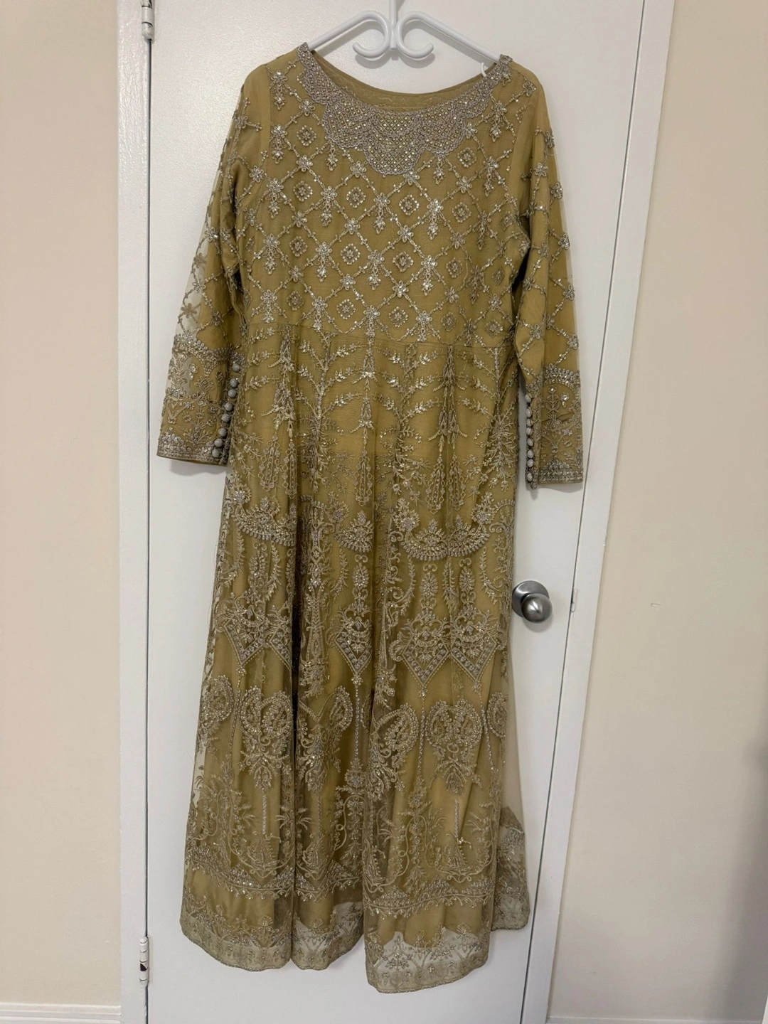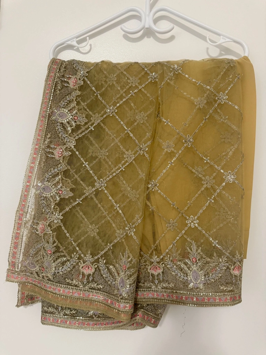 Beautiful mustard yellow Pakistani shalwar kameez. Intricate embroidery throughout. Long sleeves. Matching dupatta. Elegant and festive.