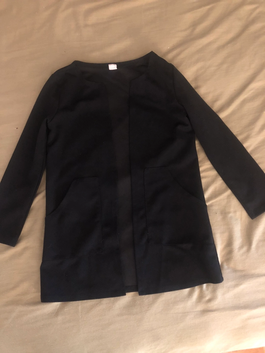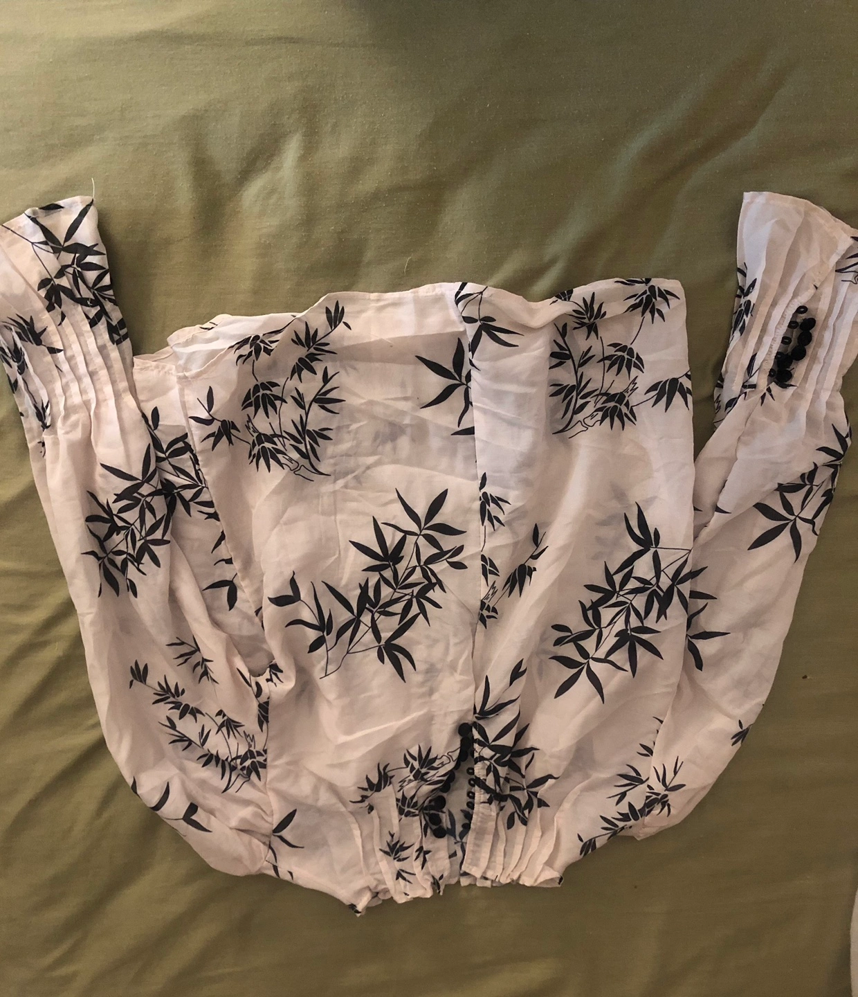 Bundle includes five women's tops. One white floral long-sleeved blouse with a tie neckline. One burgundy long-sleeved top with ruffled detailing. One black long cardigan with pockets. Two more blouses, one white with black bamboo print and one with a floral design.