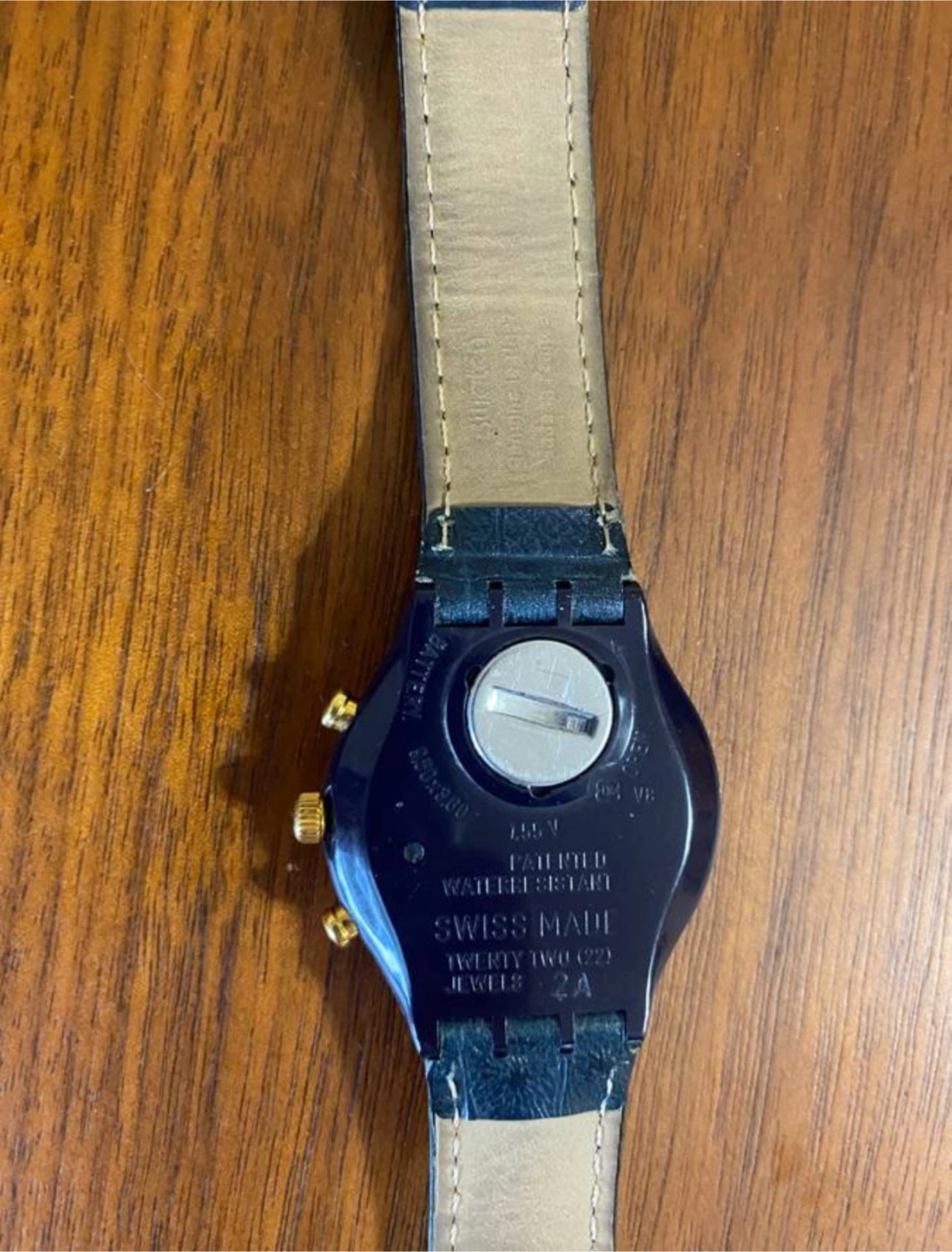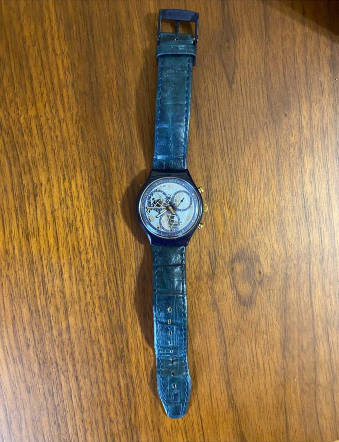 Vintage Swatch watch. Blue plastic case. Leather strap. Chronograph functions. World map detail on the face.