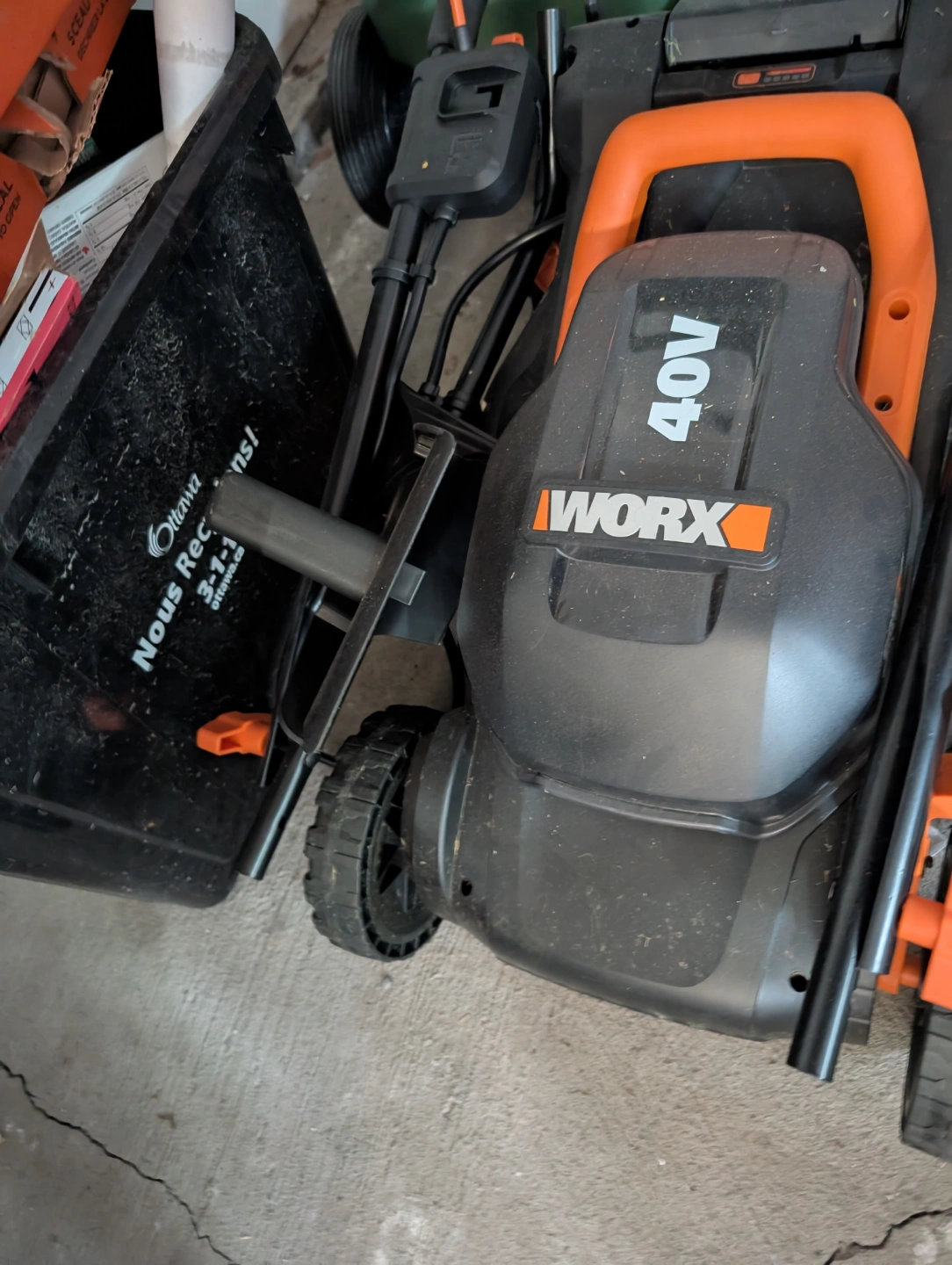 14-inch cordless mulching lawn mower. 40V Power Share battery system. Top-rated. Used for one season.