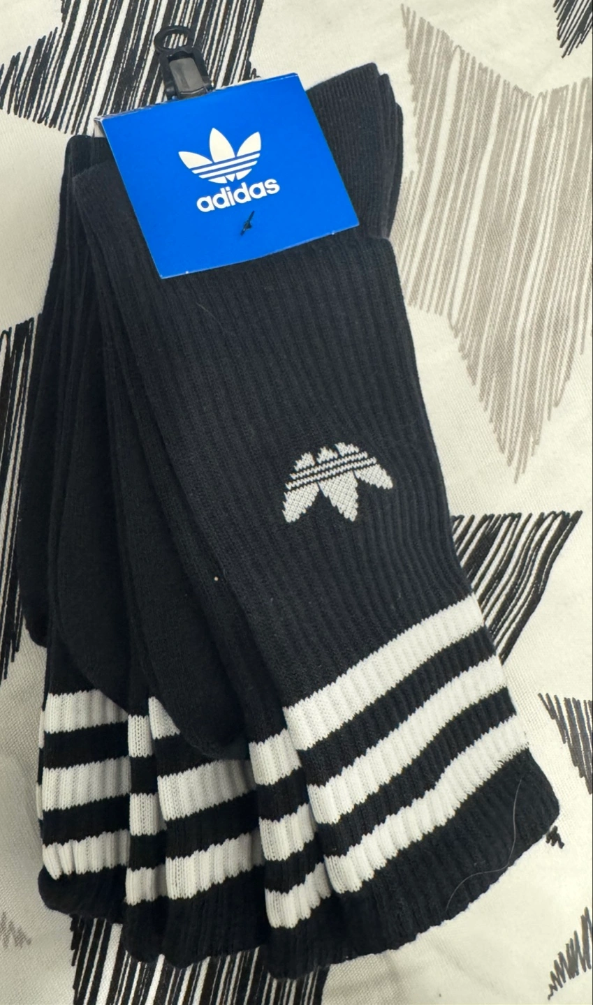 New Adidas crew socks. Black with white stripes. Classic Adidas Trefoil logo. Sold as a pack of 3.