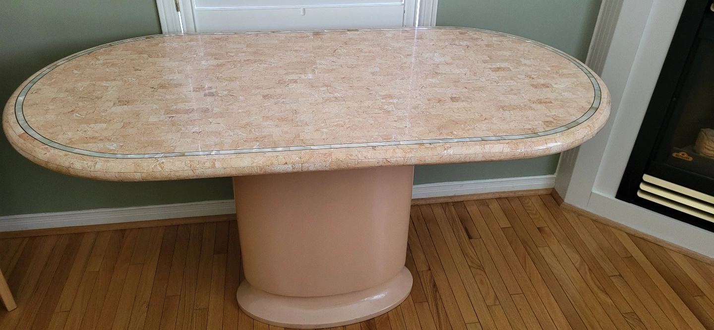 Beautiful oval occasional table. Features a beige marble mosaic top with mother-of-pearl inlay. Unique pedestal base. Perfect for a hallway or living room.