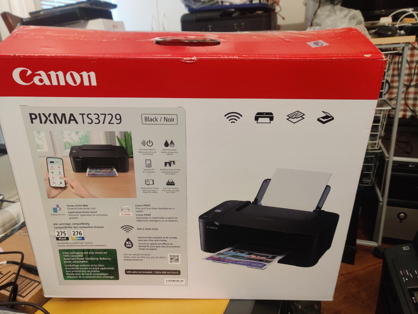 New Canon PIXMA TS3729 printer. Black colour. Wireless capabilities. Includes ink cartridges 275 and 276. PosterArtist software available. Mobile printing.