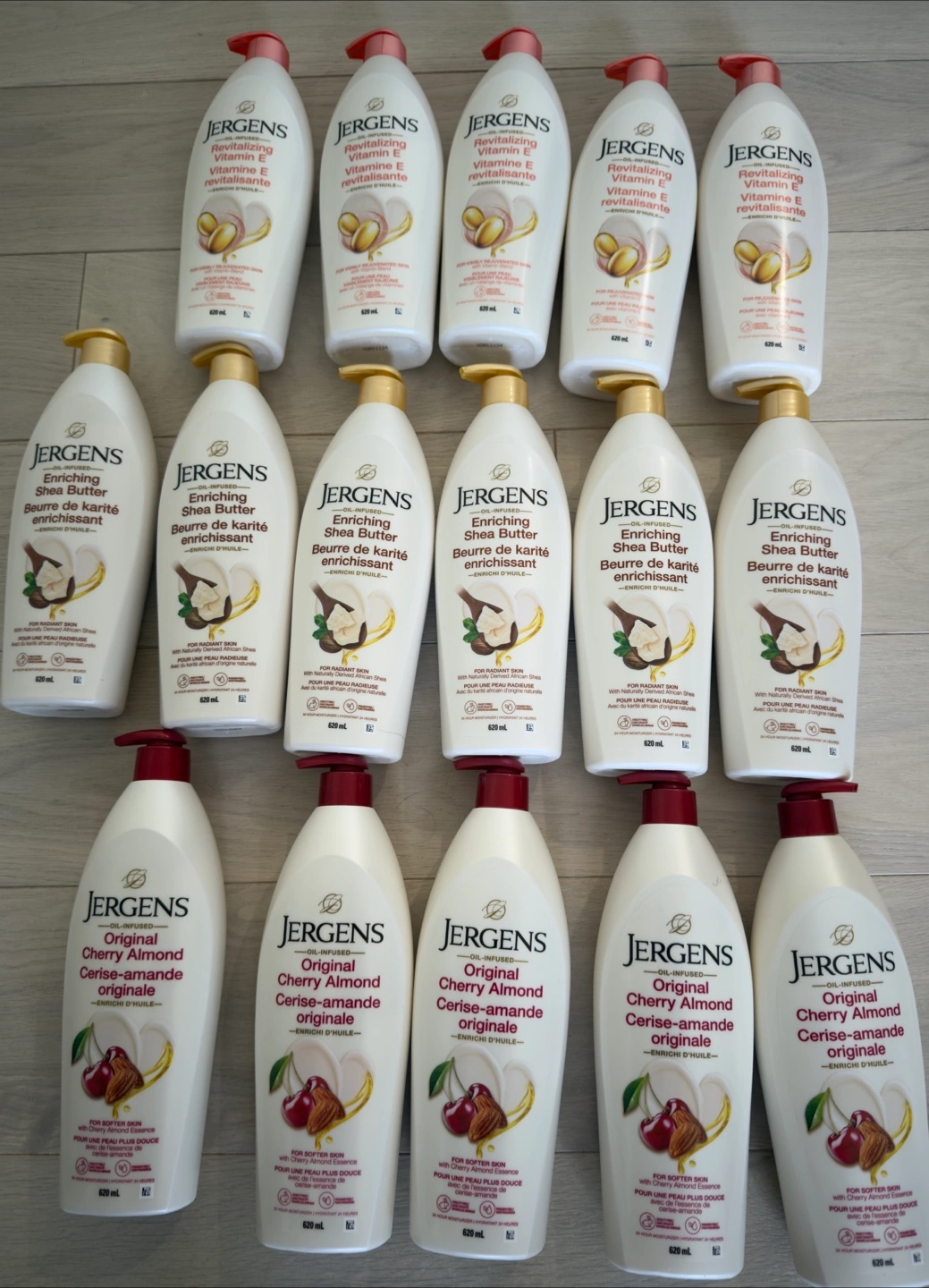 Large lot of Jergens lotion. Includes both Revitalizing Vitamin E and Enriching Shea Butter varieties. Original Cherry Almond scent also available. 620ml bottles.