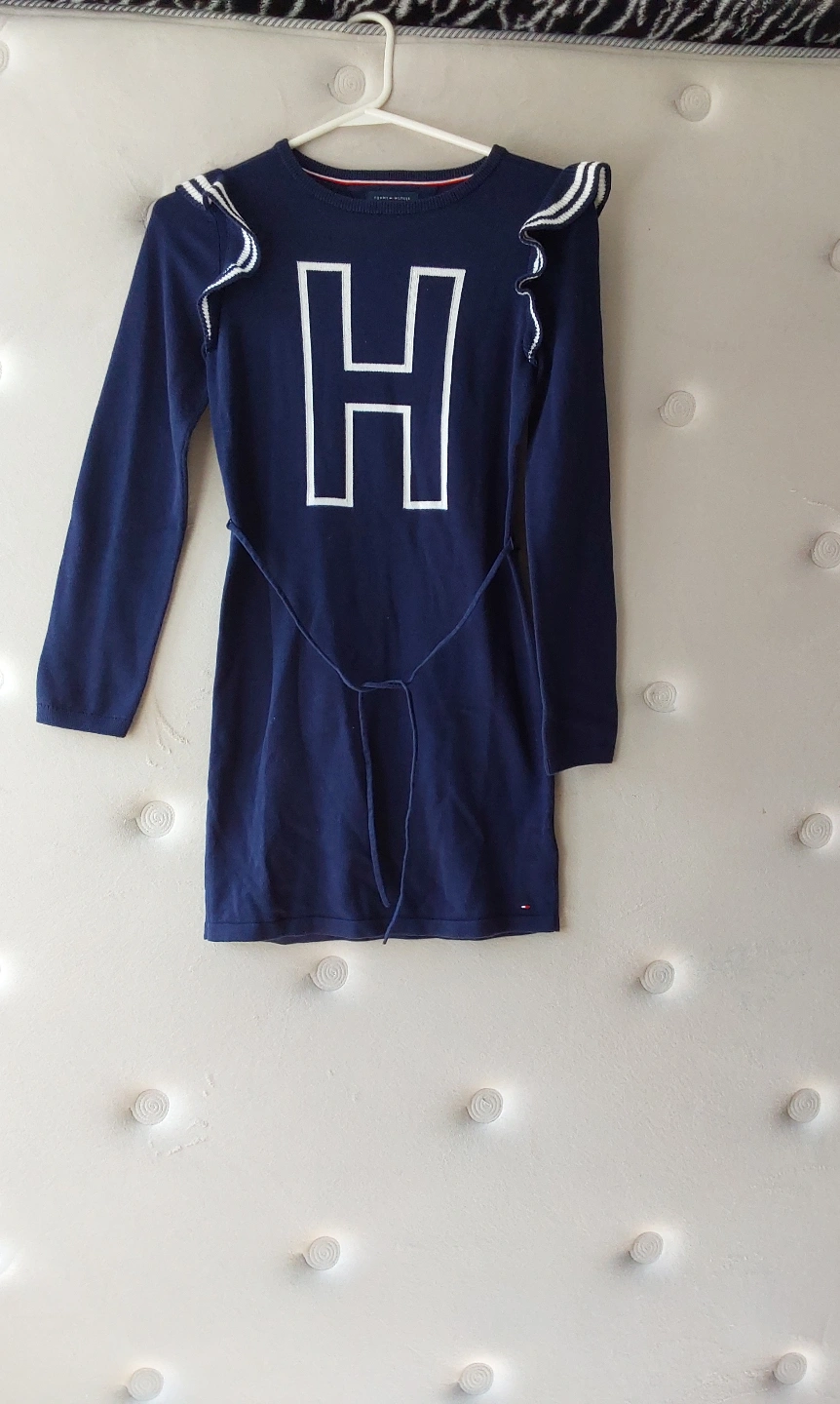 Adorable navy blue sweater dress. Features a large white H on the front and ruffled shoulders. Long sleeves and drawstring waist. Great for fall or spring.