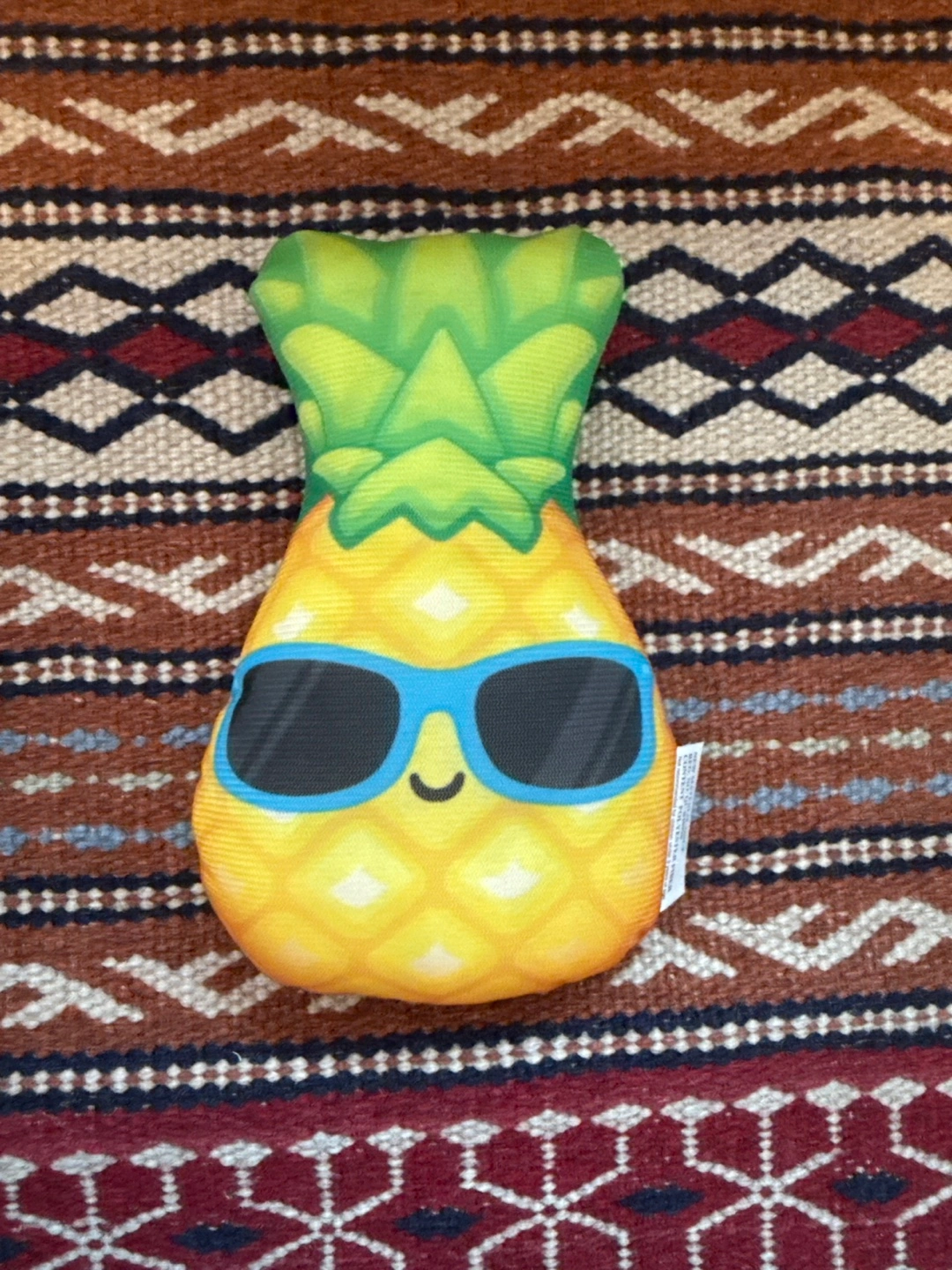 Five cute and colourful plush toys. Pineapple, crocodile, penguin, cat, and sloth designs. Perfect for kids or collectors. Small size, great for travel.