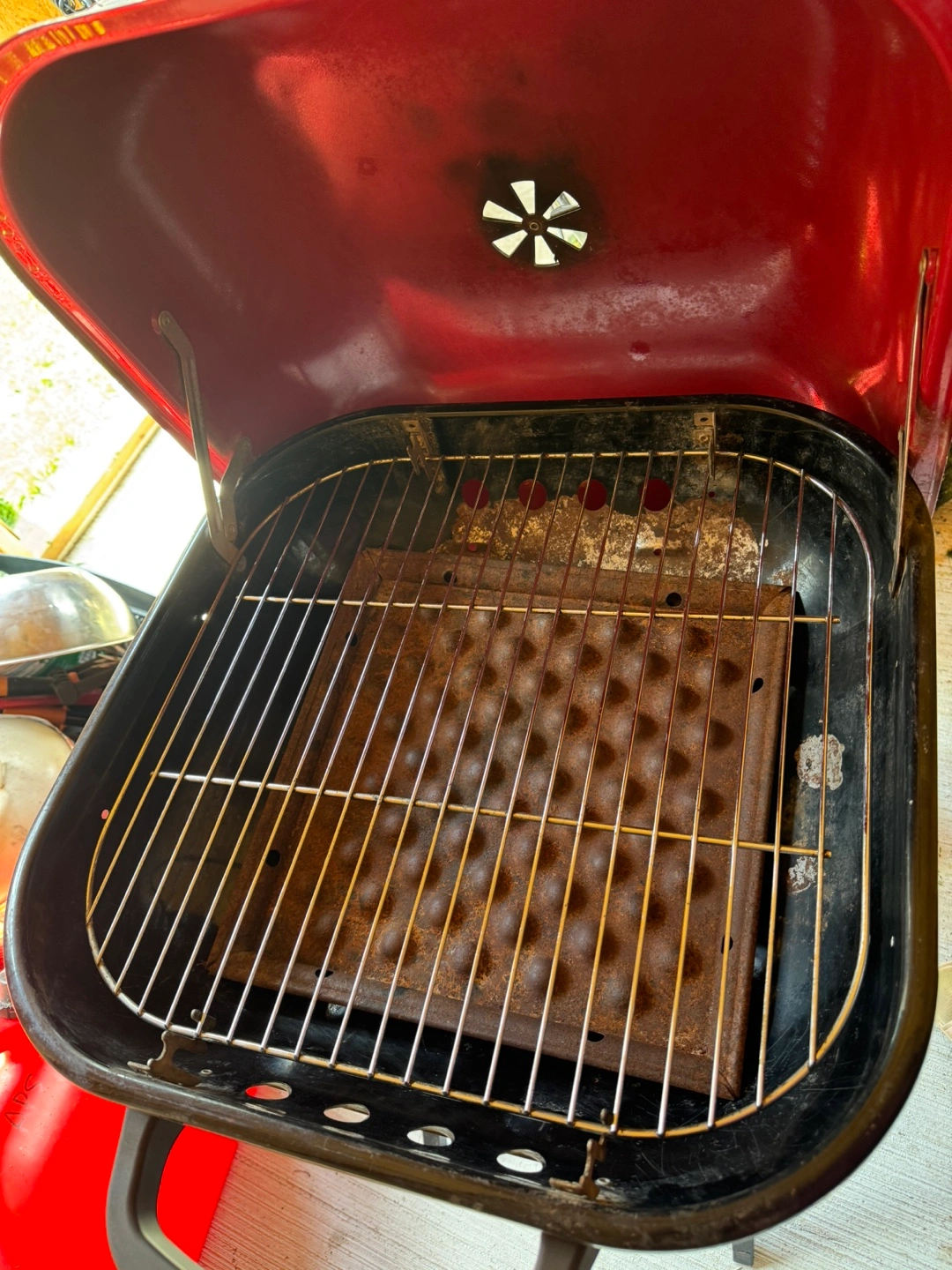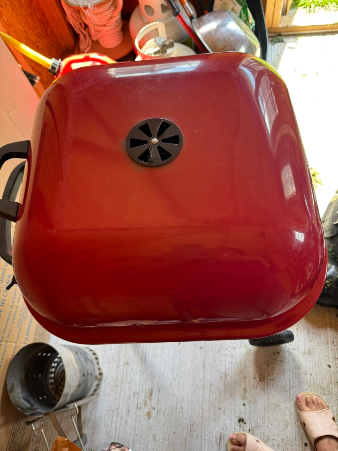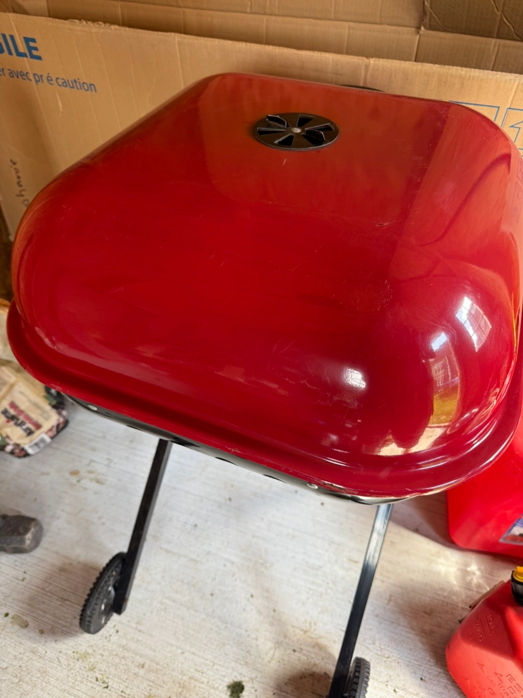 Portable charcoal barbecue. Red enamelled exterior. Black metal legs and grill grate. Some rust on the grill grate. Perfect for small spaces.