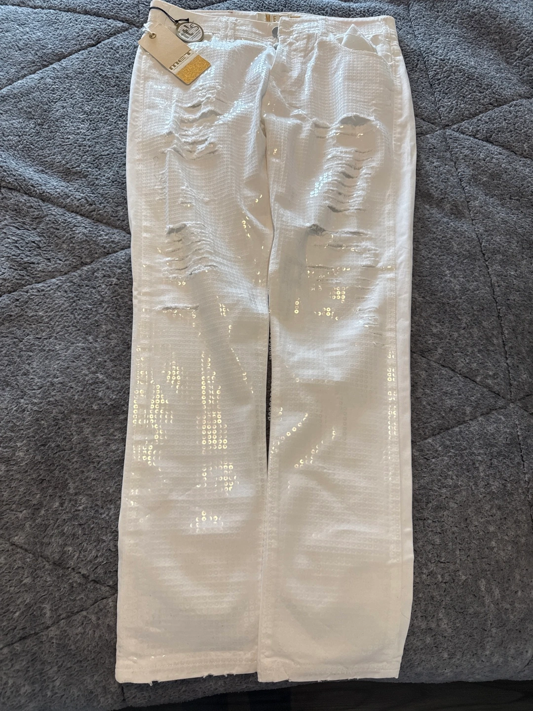 White distressed jeans with silver sequin detailing. Ripped and features a unique design. New with tags. Italian brand