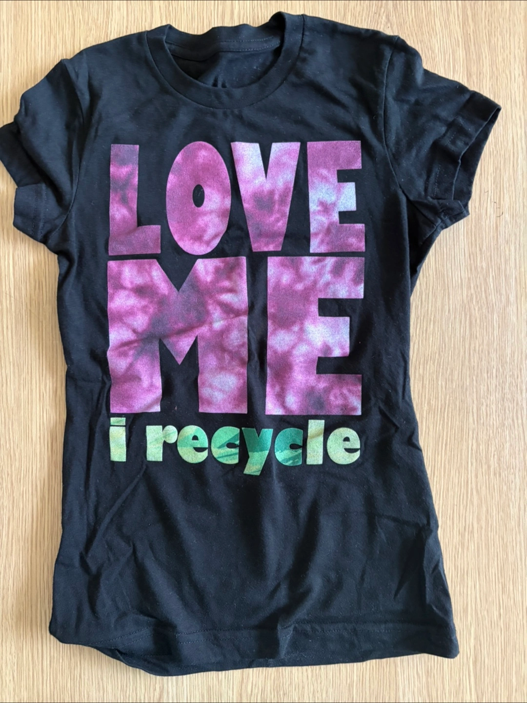Check out this new black graphic tee for girls, size 7/8. It features a LOVE ME / i recycle design on the front and a recycle heart design on the back.