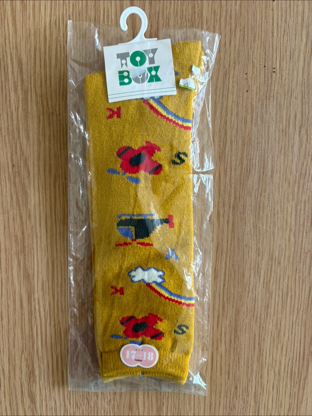 These are a new pair of Toy Box socks in a children's size 17-18. They are still sealed in their original packaging. The socks feature a charming pattern of animals, rainbows, and clouds, making them a delightful addition to any child's wardrobe.
