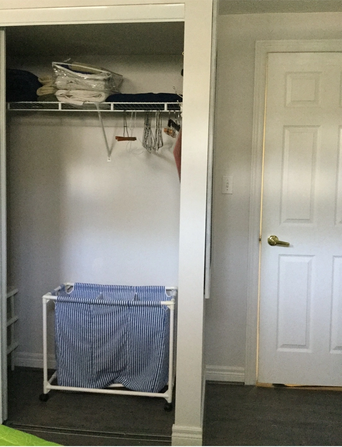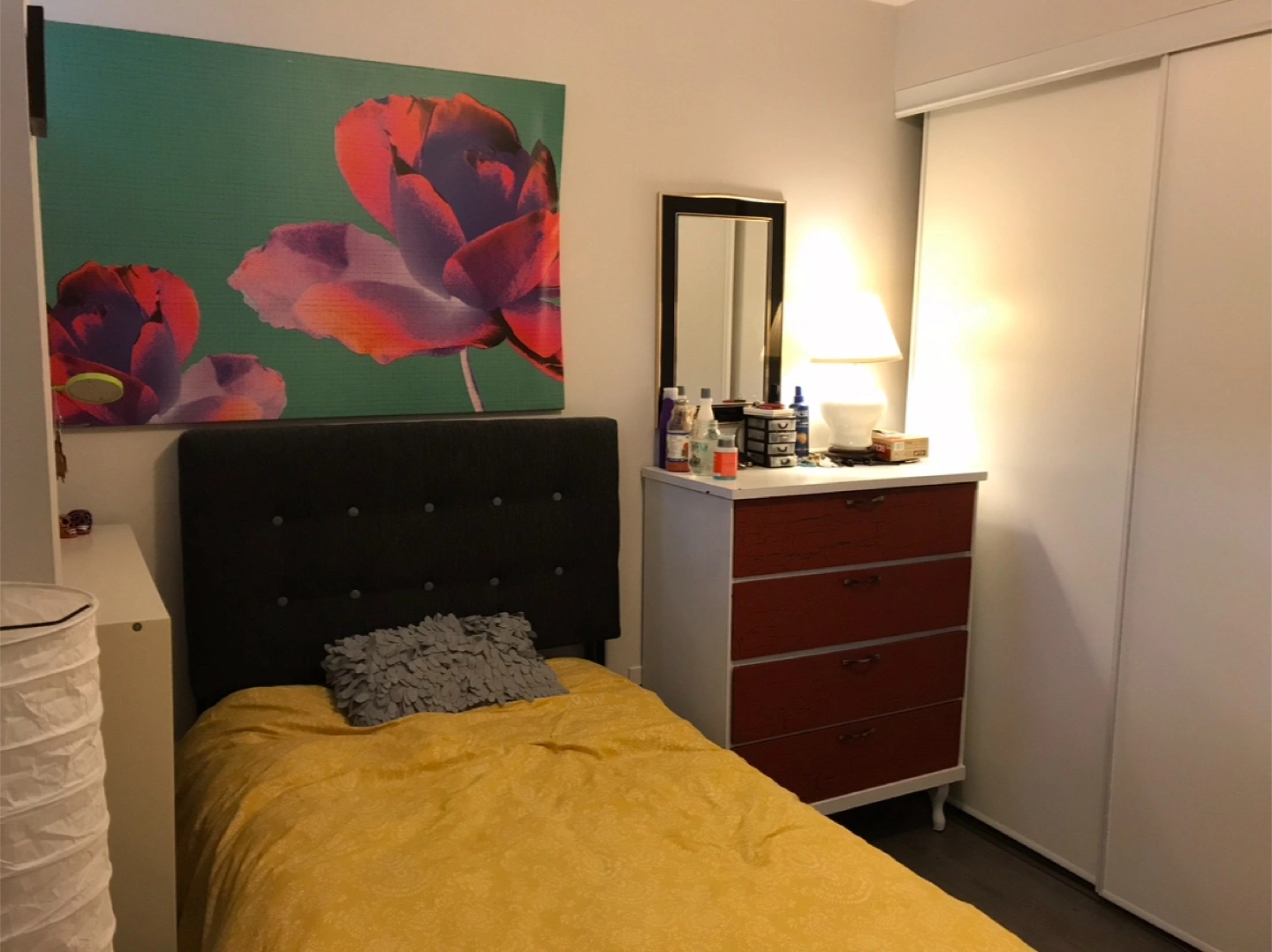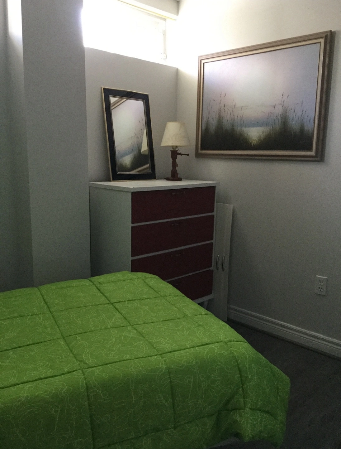 is private, fully-furnished bedroom room with a single XL electronic-adjustable bed frame and comfortable mattress (double closet, dresser, desk, lamps) in our lower walkout basement level.