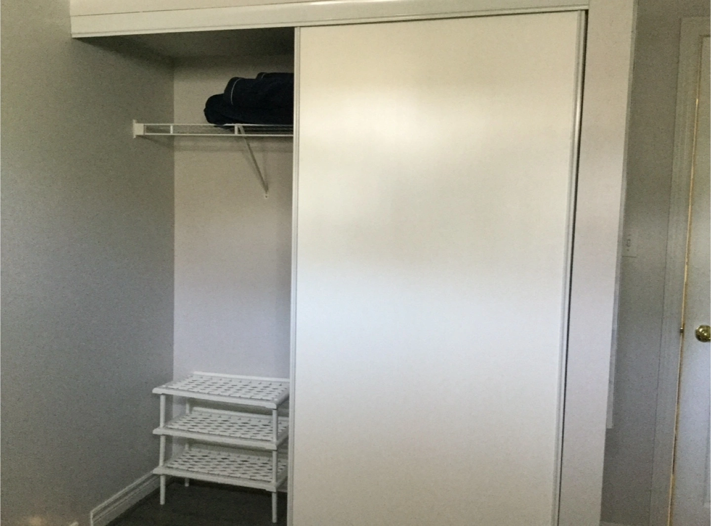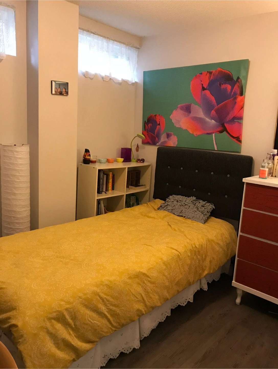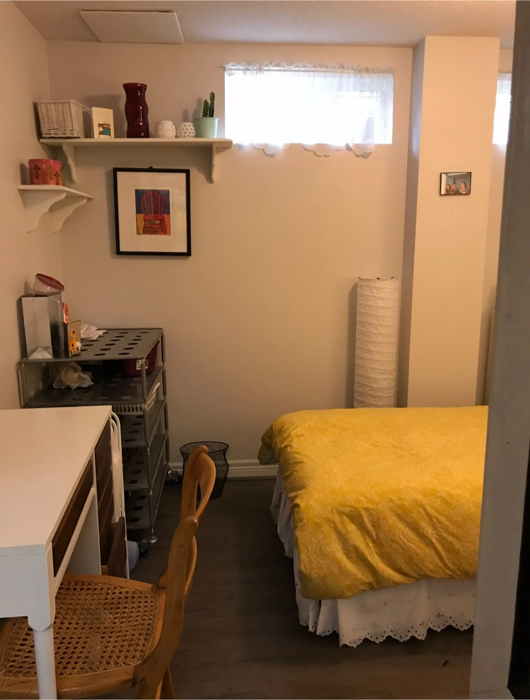 is private, fully-furnished bedroom room with a single XL electronic-adjustable bed frame and comfortable mattress (double closet, dresser, desk, lamps) in our lower walkout basement level.