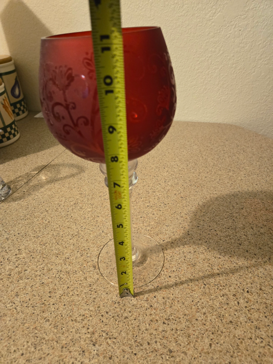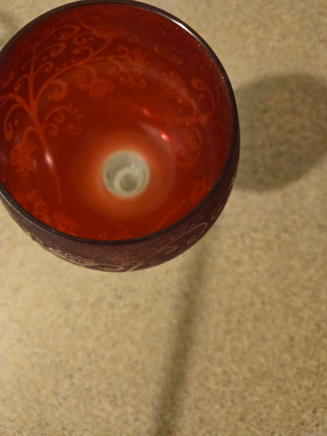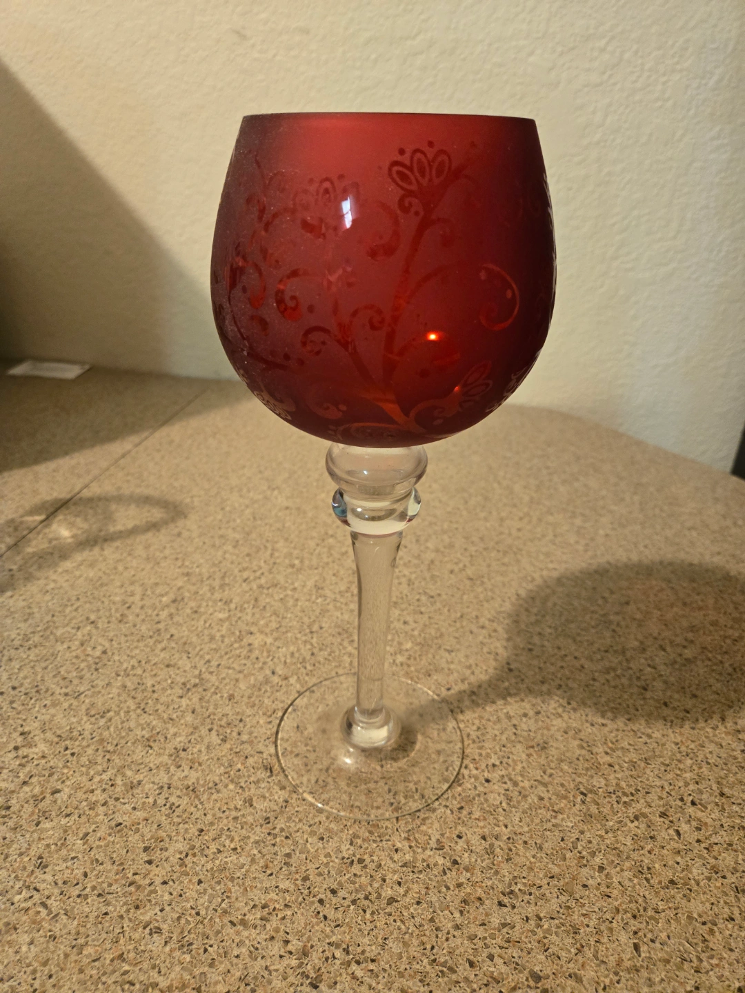 Elegant red glass votive holder. Features an etched floral design. Tall stem. Perfect for adding ambiance to your home. 11" tall