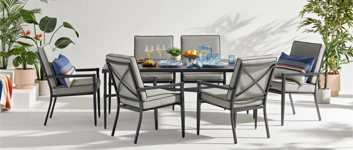 Seven-piece outdoor dining set. Includes one rectangular table and six chairs. Powder-coated steel frame. Grey cushions. Weather-resistant.