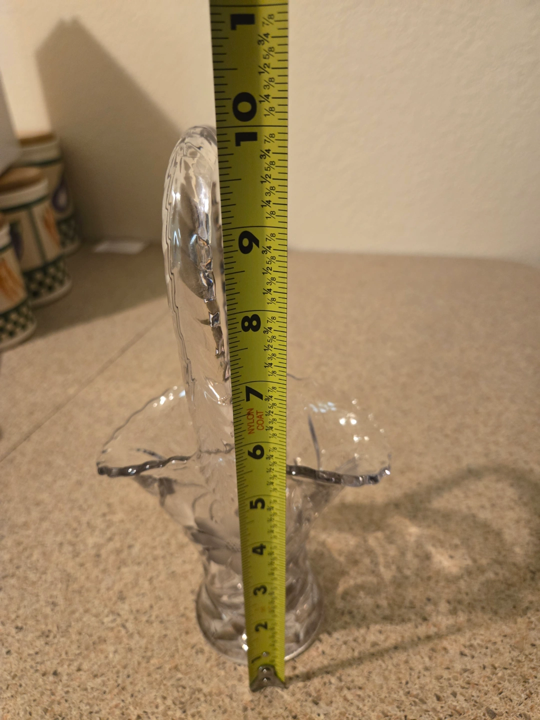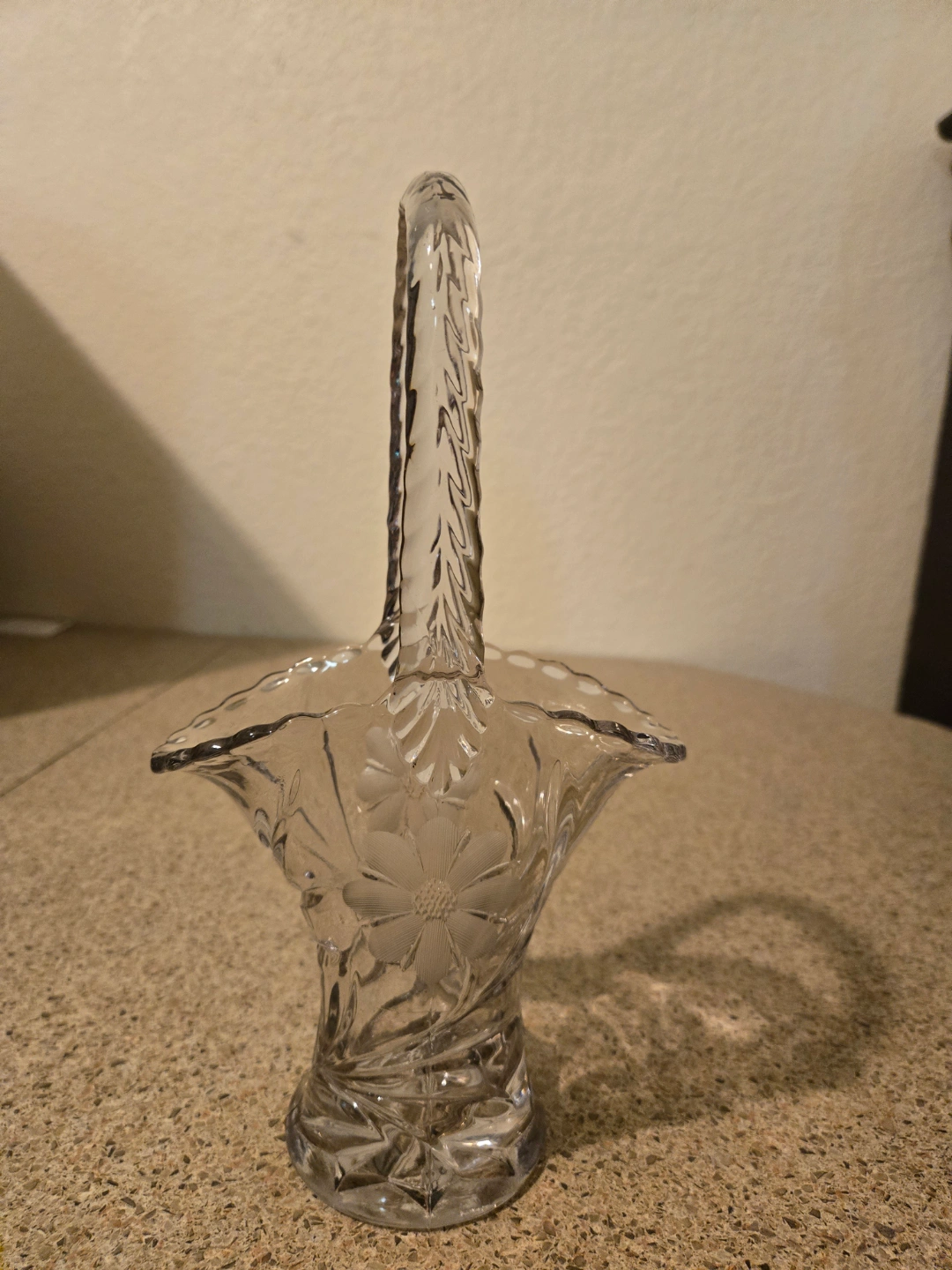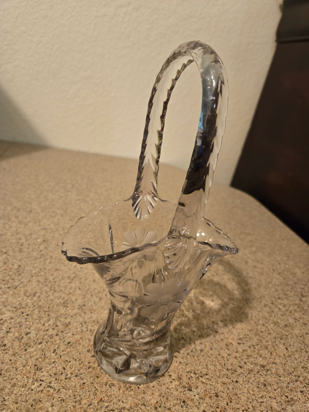 Decorative Small glass basket. Features etched floral design. 10 inches tall.