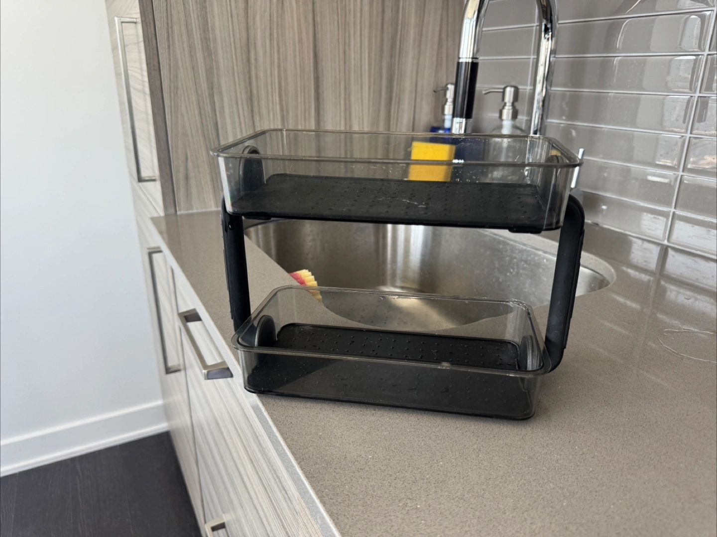 Clear plastic organizer with two tiers. Black silicone handles. Great for storing sponges, brushes, spices, or other small kitchen items. Stackable design.