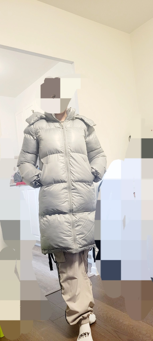 19Women's long puffer jacket. Silver grey colour. Features a hood and zipper closure. Side pockets. Excellent for cold weather.
