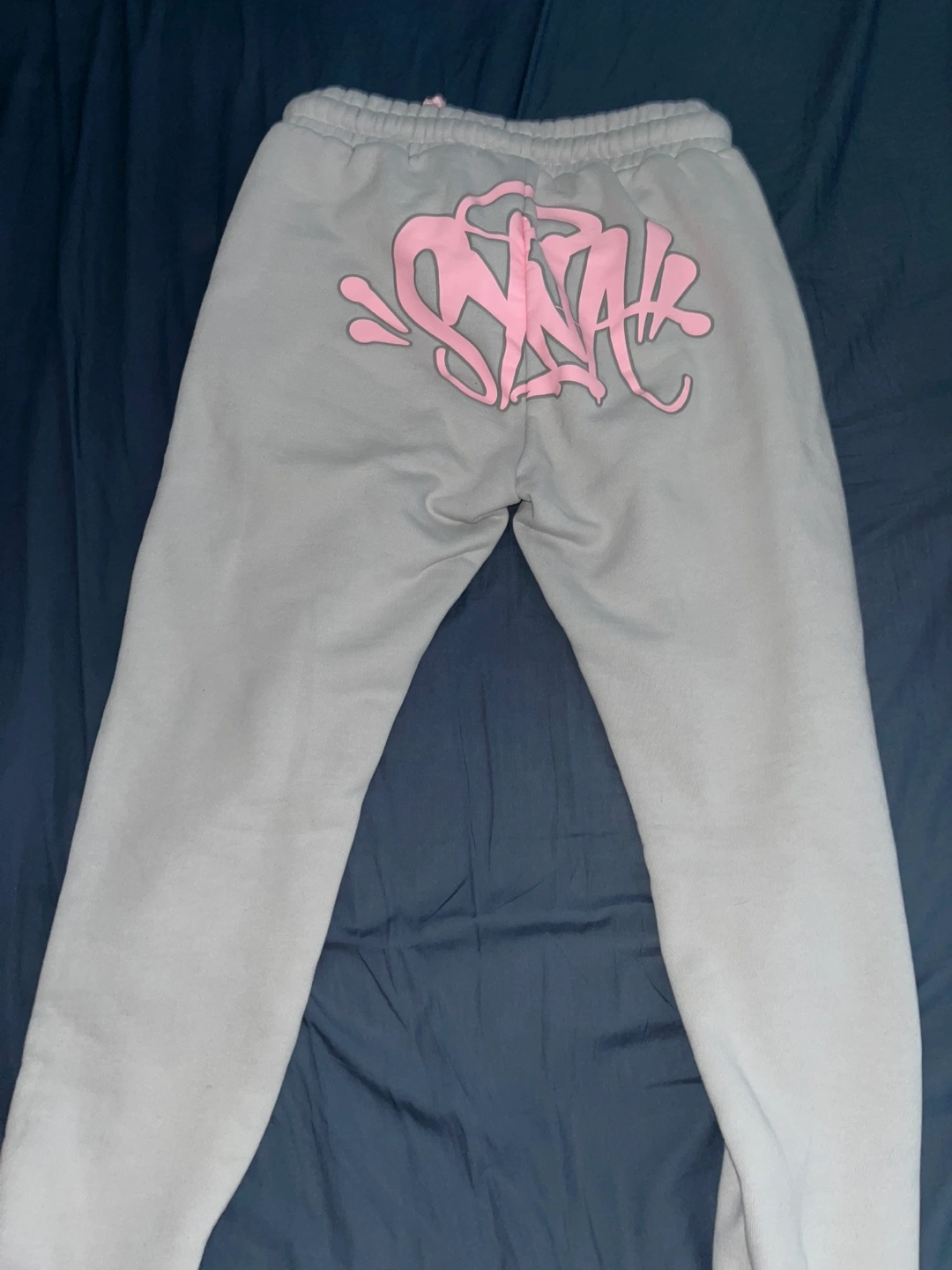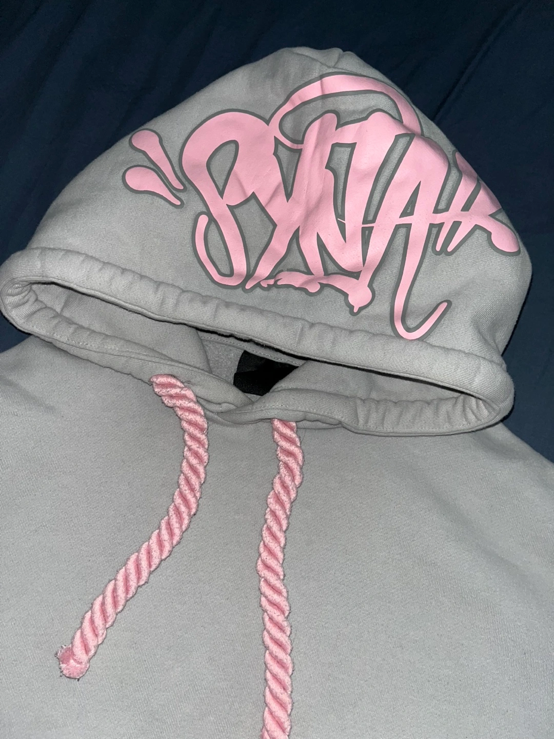 Light grey joggers and Hoodie. Pink drawstrings and embroidered detail. SYNA WORLD branding on back of the joggers and Front of the hood on hoodie. Includes stickers in the bag too.