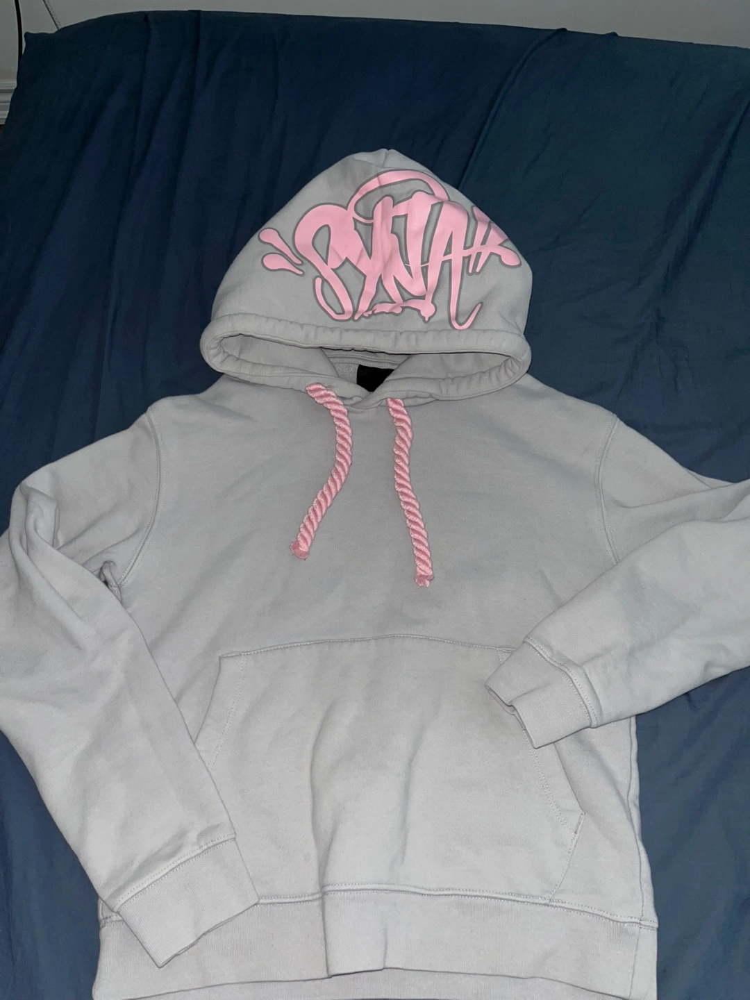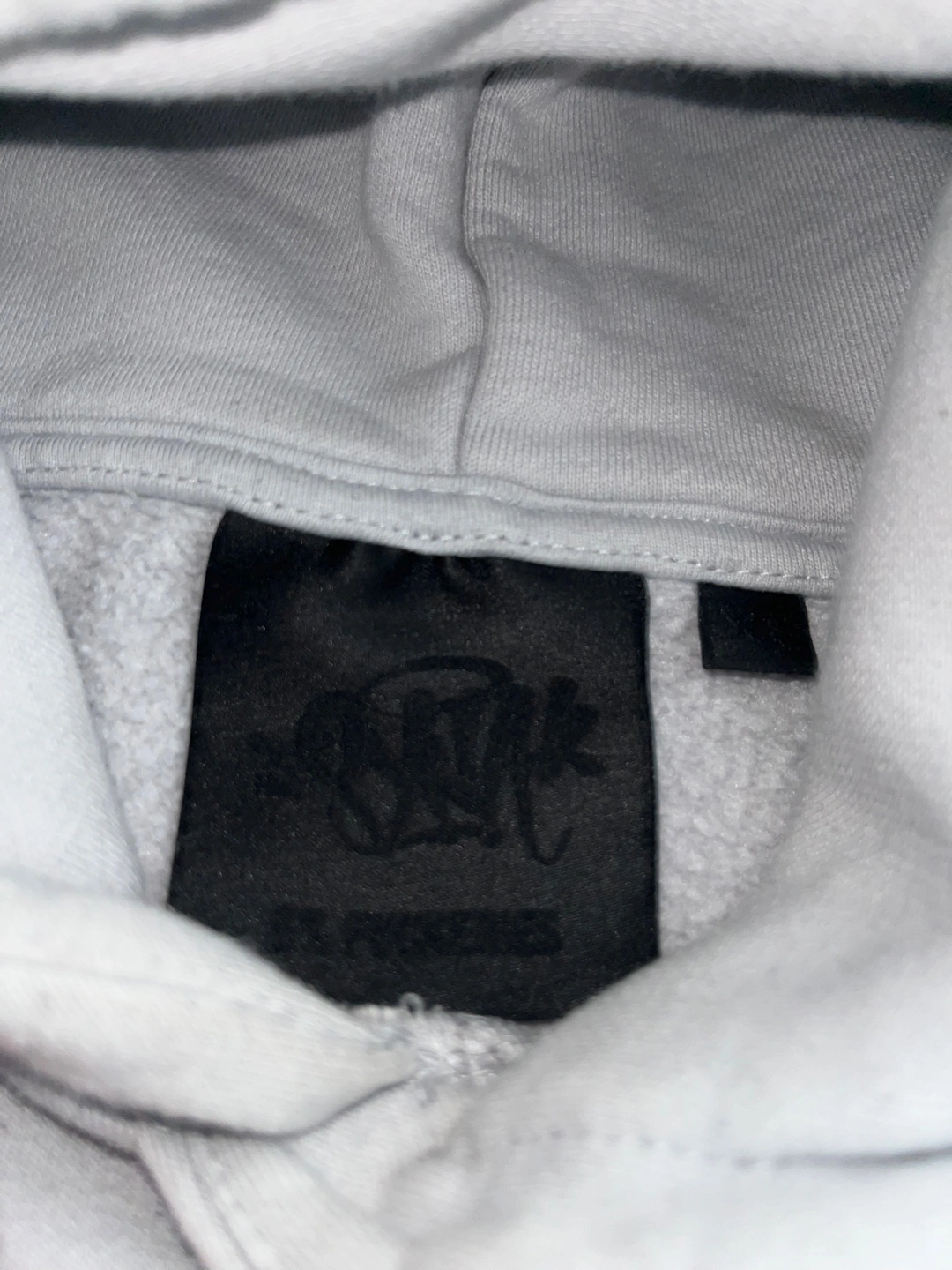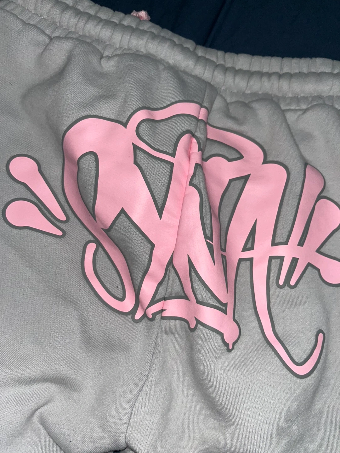Light grey joggers and Hoodie. Pink drawstrings and embroidered detail. SYNA WORLD branding on back of the joggers and Front of the hood on hoodie. Includes stickers in the bag too.